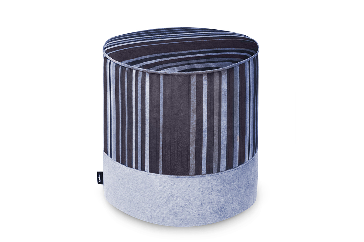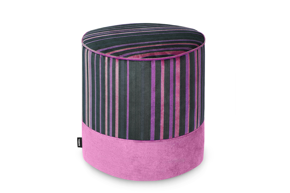 Pufy NELIA wykonano z aksamitnego materiału, który jest niezwykle przyjemny w dotyku. Cała kolekcja posiada ozdobny, pasiasty wzór w kolorach zielonym, różowym i niebieskim połączonych z kolorem czarnym.