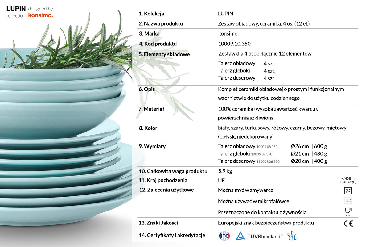 Kolekcja LUPIN została stworzona przez naszych najlepszych projektantów w oparciu o najwyższe standardy jakości i komfortu używania. Zestaw LUPIN jest autorskim produktem Konsimo wyprodukowanym w najwyższym standardzie. Najlepszej jakości kamionka zapewnia, że cały zestaw jest niezwykle wytrzymały i odporny na uszkodzenia. Doskonale nadaje się do mycia zarówno ręcznego jak i w zmywarce. Skład ceramiki sprawia, że świetnie znosi ona wysoką temperaturę, pozwalając na podgrzewanie potraw w mikrofalówce. Ceramika nie pochłania zapachów, co sprawia, że każda twoja potrawa zawsze będzie chwalić się swoim wspaniałym aromatem.