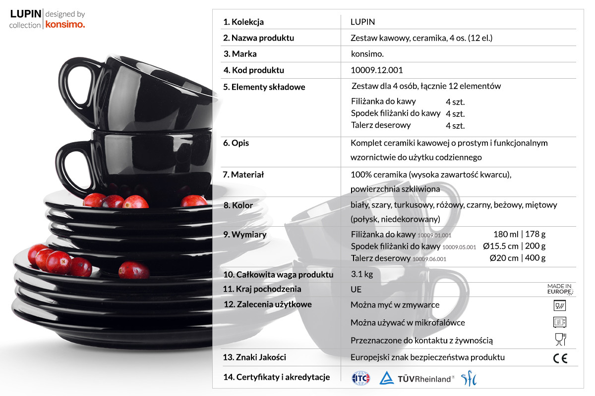 LUPIN zobacz całą kolekcję Zestaw kawowy, 4 os. (12 el) - kolor czarny