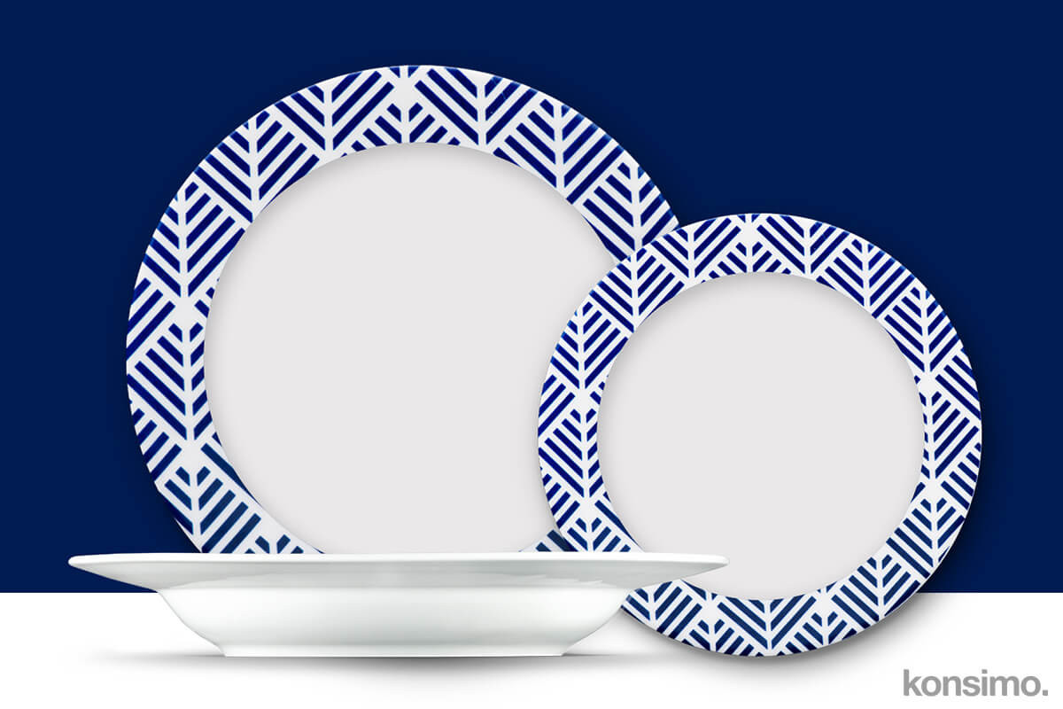 W zestawie znajduje się duży talerz obiadowy, talerz głęboki oraz talerzyk deserowy.