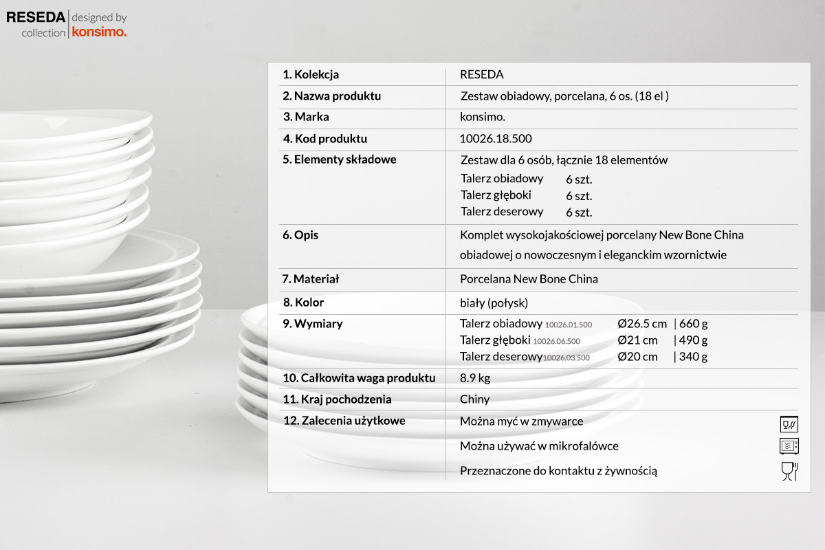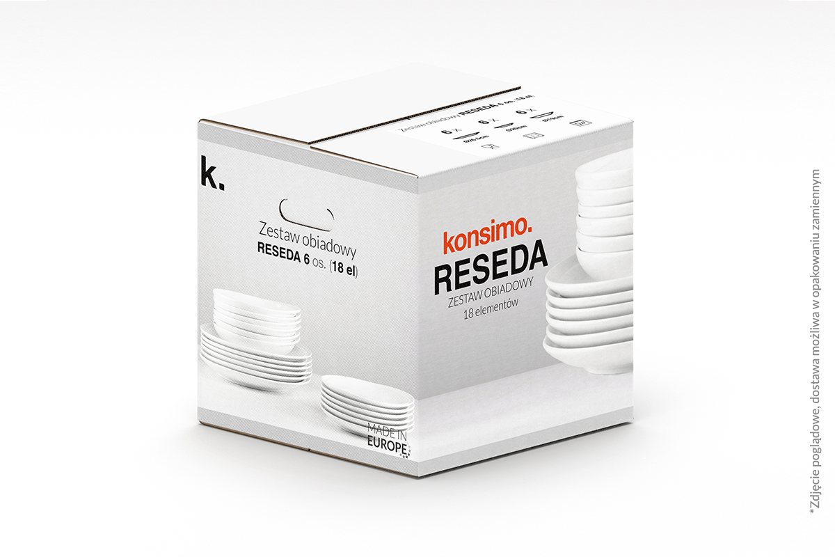 Najlepsi Designerzy Konsimo dołożyli wszelkich starań, aby kolekcja RESEDA cechowała się najwyższym standardem potwierdzonym w badaniach konsumentów   Zestaw RESEDA jest autorskim produktem Konsimo wyprodukowanym w najwyższym standardzieNajlepszej jakości porcelana zapewnia, że cały zestaw jest niezwykle wytrzymały i odporny na uszkodzenia. Doskonale nadaje się do mycia zarówno ręcznego jak i w zmywarce. Skład porcelany sprawia, że świetnie znosi ona wysoką temperaturę, pozwalając na podgrzewanie potraw w mikrofalówce. Porcelana nie pochłania zapachów, co sprawia, że każda twoja potrawa zawsze będzie chwalić się swoim wspaniałym aromatem.