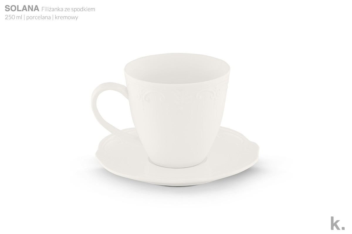 W zestawie znajduje się wyjątkowa filiżanka do kawy o pojemności 250 ml ze spodkiem i talerzyk deserowy.