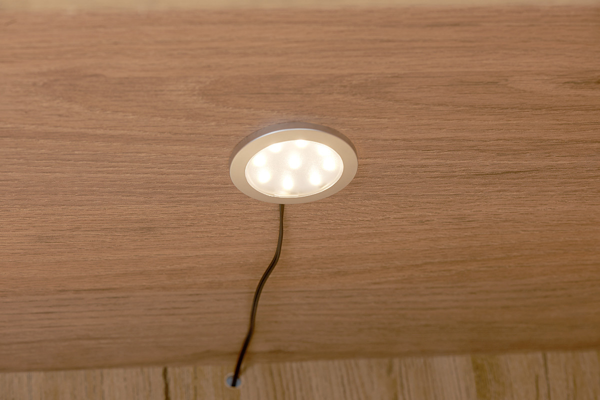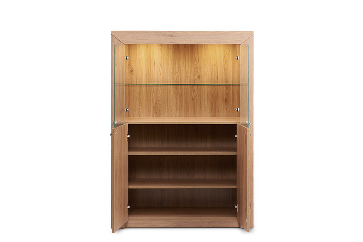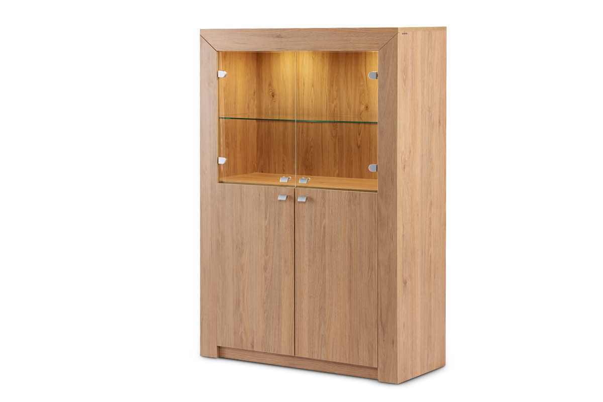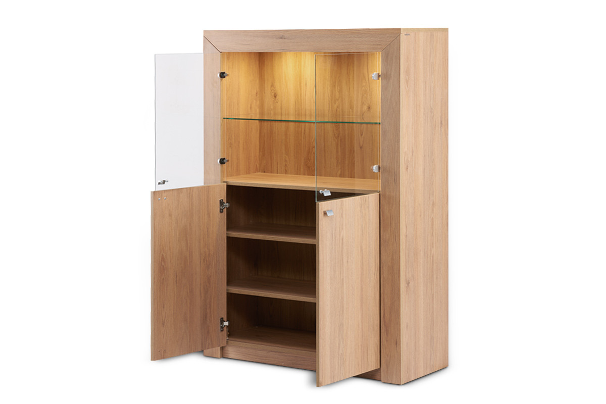 Zaprojektowana z myślą o potrzebach współczesnego użytkownika, witryna z kolekcji nowoczesnych mebli CALDO wyróżnia się najwyższą jakością. Za drzwiczkami z hartowanego szkła znajduje się przestrzeń na ekspozycję. Pięknie podkreśla ją modne, ciepłe oświetlenie LED-owe w standardzie mebla. Obsługiwane za pomocą włącznika nożnego, dodatkowe światło może być wykorzystywane cały czas lub tylko wtedy, gdy zachodzi taka potrzeba – np.