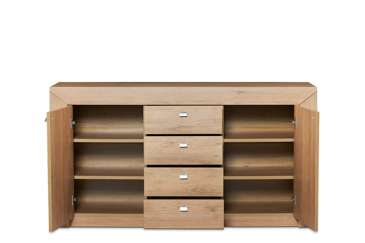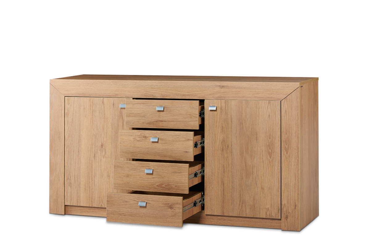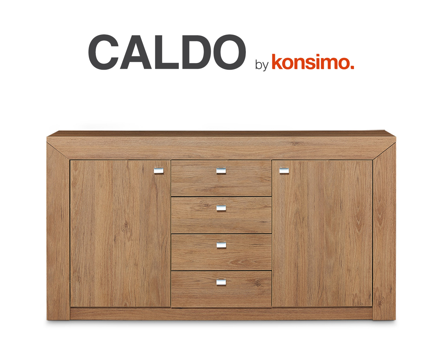 Dwie szafki z mocnymi półkami, cztery głębokie szuflady, na górze blat na stylową, otwartą ekspozycję – konstrukcja komody CALDO gwarantuje mnóstwo miejsca do przechowywania. Bezpieczna i wytrzymała dzięki użyciu wysokiej jakości płyty i specjalnego mocowania tylnej ścianki, modernistyczna szafka CALDO stanie się znakomitą inwestycją na lata. Nogi z opcją poziomowania umożliwiają dopasowanie wysokości mebla do potrzeb wnętrza.