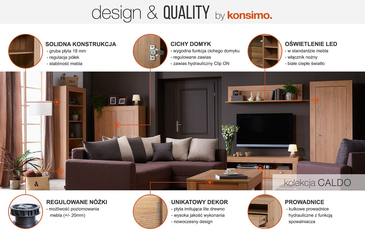 Rośliny doniczkowe, książki, ozdoby i dekoracje – to tylko niektóre elementy domowego wyposażenia, które zasługują na wyeksponowanie. Nowoczesna półka wisząca z kolekcji CALDO wykonana została z bardzo mocnej płyty, dzięki czemu z powodzeniem utrzymuje nawet duży ciężar. Drewnopodobny laminat chroni powierzchnię przed ścieraniem i uszkodzeniami, a do tego ułatwia utrzymanie półki wiszącej w doskonałej czystości.