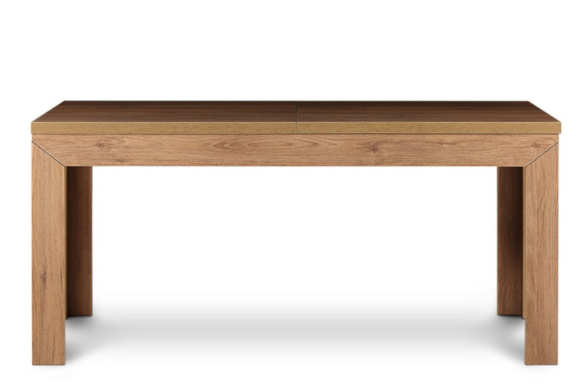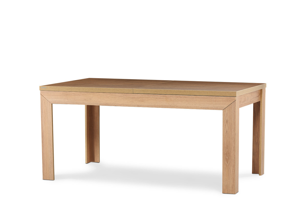 Wykonany z wysokiej jakości płyty, nowoczesny stół CALDO z powodzeniem znosi nawet codzienne, intensywne użytkowanie. Drewnopodobny laminat w kolorze dębu naturalnego nie tylko doskonale się prezentuje, ale też chroni mebel przed ścieraniem czy uszkodzeniem. Prostota formy sprawia, iż stół rozkładany z tej modernistycznej kolekcji jest wyjątkowo łatwy do utrzymania w czystości.