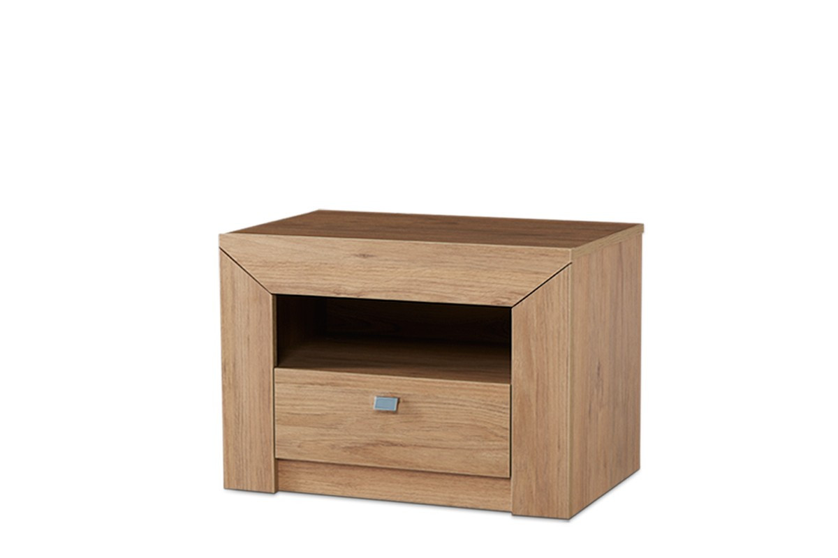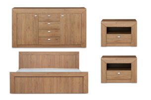 Dostępny w dwóch wersjach różniących się szerokością łóżka, komplet nowoczesnych mebli sypialnianych CALDO wyróżnia się bezpieczeństwem i najwyższą jakością. Komoda, łóżko i szafki nocne wykonane zostały z solidnej płyty laminowanej w kolorze jasnego drewna dębowego. Dzięki niezwykłej prostocie formy są nie tylko eleganckie, ale też łatwe do utrzymania w czystości. Nowoczesne łóżko gwarantuje komfort i wygodę.