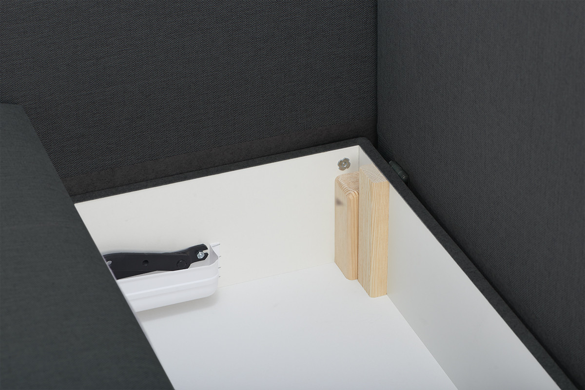 • Skrzynia: płyta pilśniowa 3,2mm, wnętrze płyta wiórowa 16mm biała, zewnętrzna część skrzyni otapicerowana tkaniną techniczną
