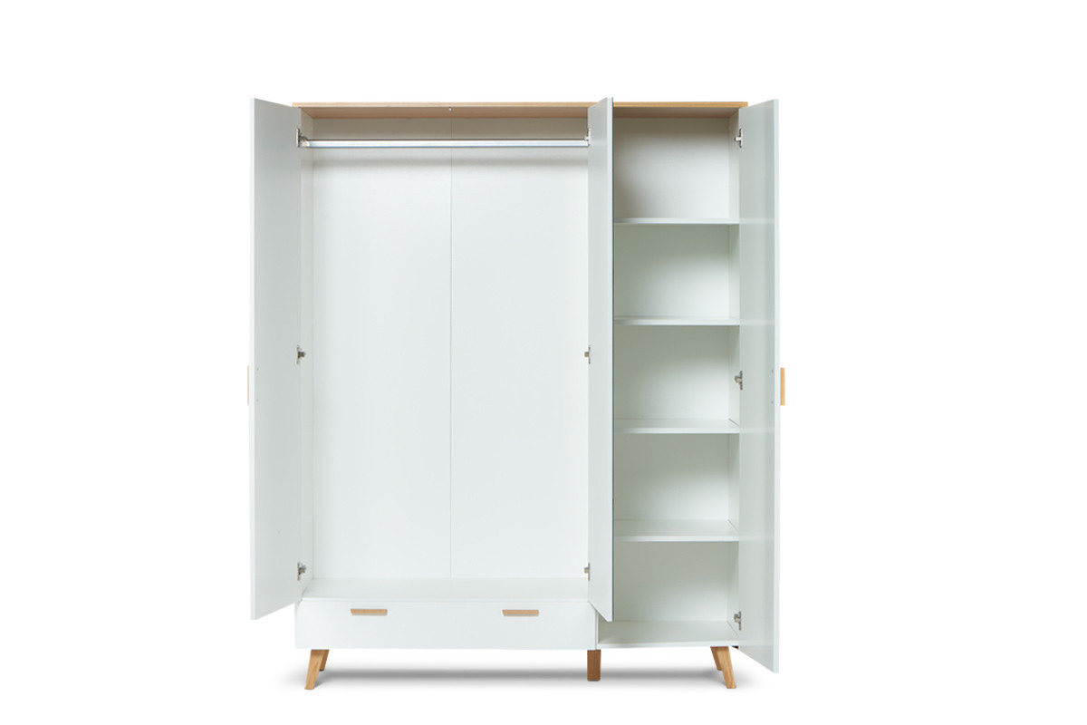 Modna, biała skandynawska szafa ubraniowa z kolekcji FRISK, została wykonana z myślą o osobach ceniących nowoczesny i prosty styl – świetnie wpisuje się w stylistykę skandynawską lub pomieszczenie zachowane w minimalistycznym, nowoczesnym charakterze. Biały kolor laminatu, drewniane nogi i wykończenia podkreślają jego skandynawski styl i nadają mu elegancji. To niedrogi produkt, który sprawi, że pomieszczenie nabierze wyjątkowego wyrazu.