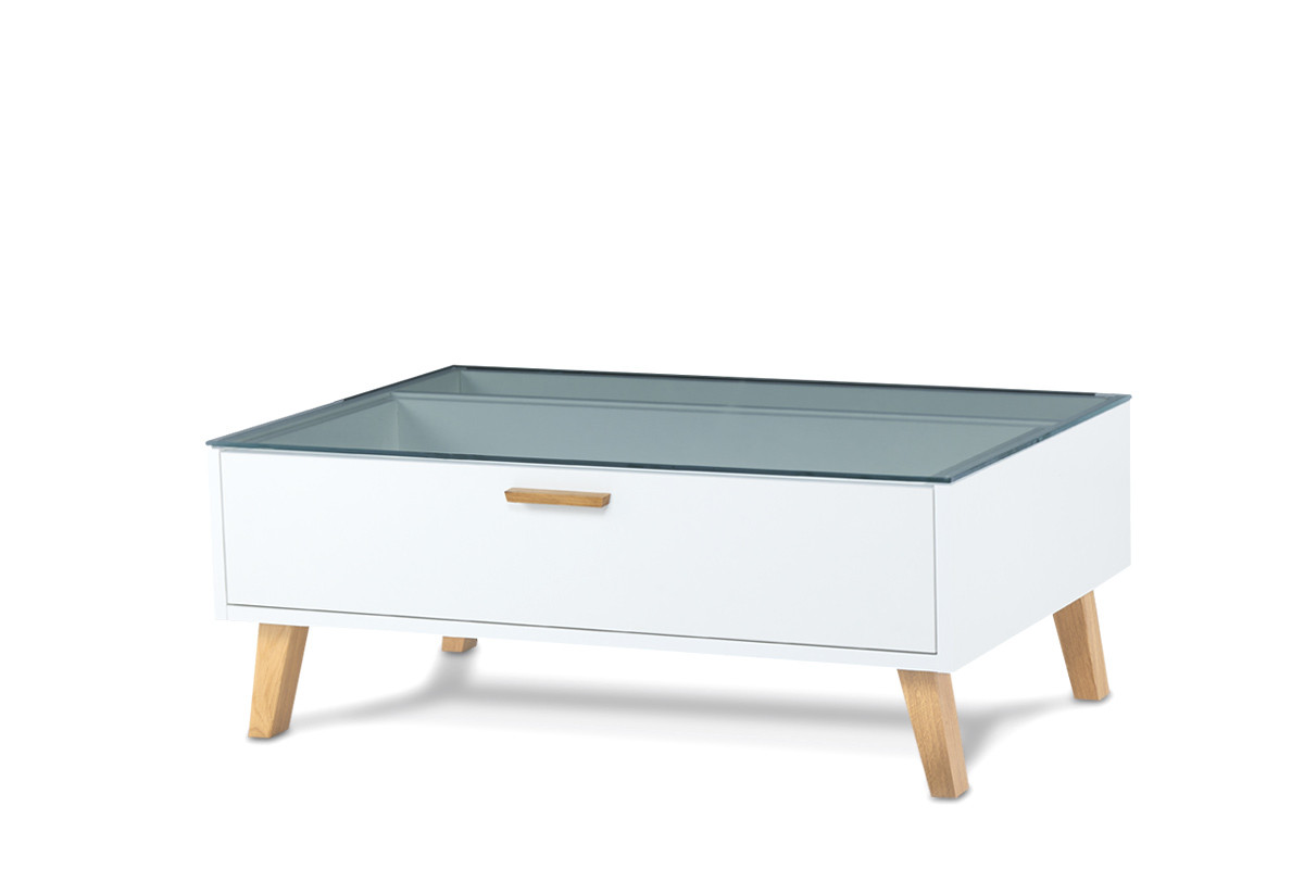 Wnętrze szuflady samo w sobie może stanowić dekorację – wszystko za sprawą blatu z hartowanego szkła, osadzonego na bezbarwnych bumperach. Stolik kawowy w skandynawskim stylu FRISK wykonany został z dbałością o najmniejsze szczegóły – dla użytkownika to gwarancja bezpieczeństwa i długiego użytkowania mebla.