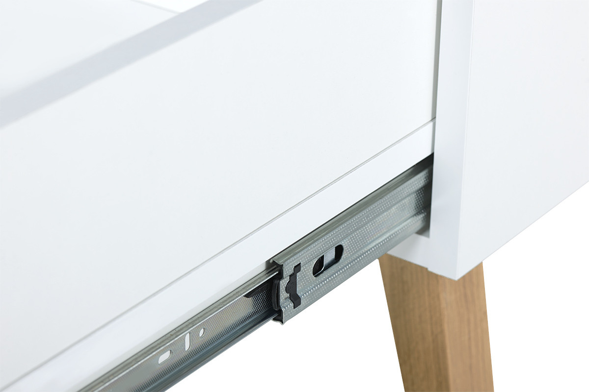 Stylowy, modny i wygodny, skandynawski stolik kawowy wykonany został z wysokiej jakości płyty, odpornej na uszkodzenia, z powodzeniem znoszącej nawet intensywną eksploatację. Pojemna, głęboka szuflada z pełnym wysuwem i kulkowymi prowadnicami hydraulicznymi pracuje cicho i niezawodnie. Konstrukcję szafki kawowej wspierają solidne drewniane nogi – dzięki nim ten minimalistyczny mebel zachowuje doskonałą stabilność.