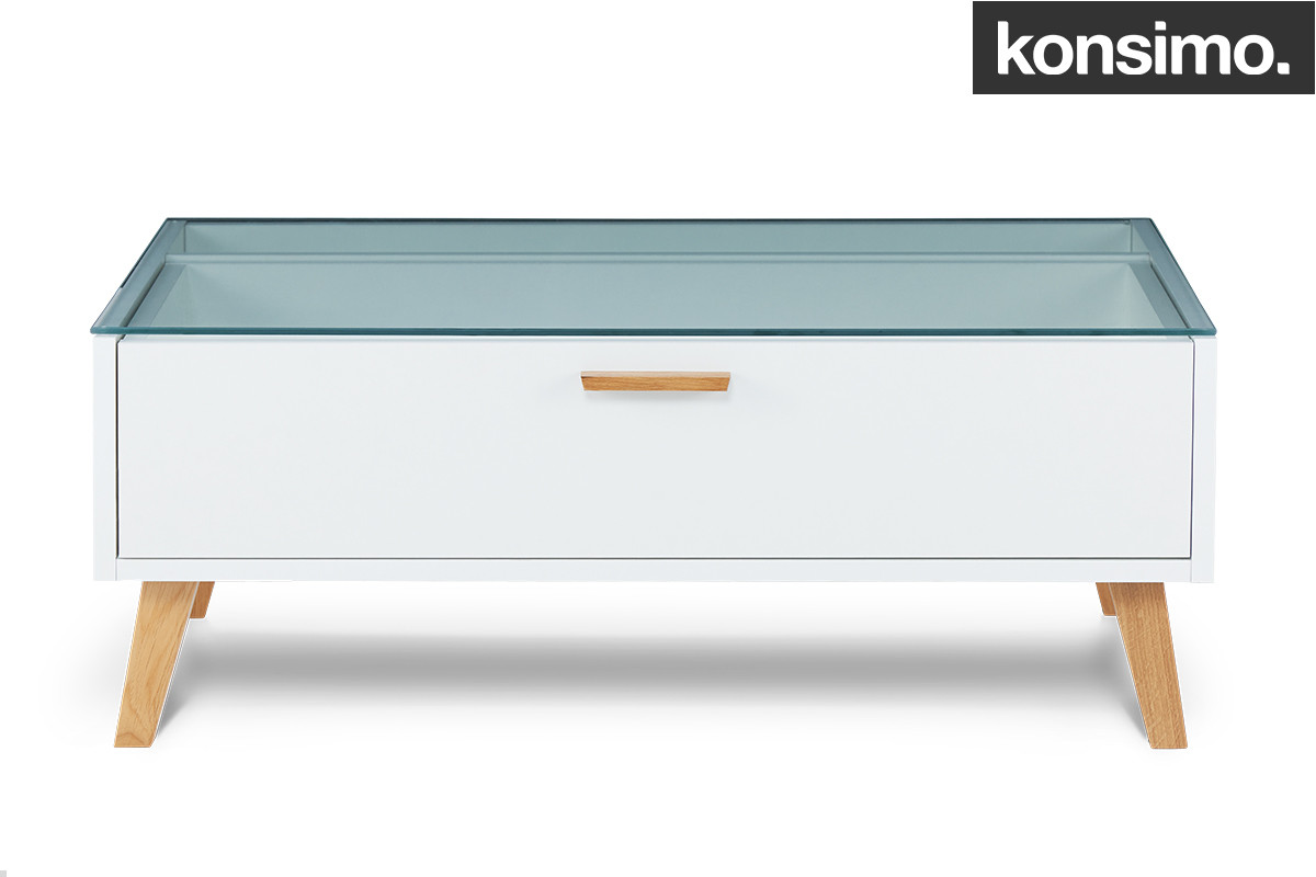 Pięknie prezentuje się samodzielnie lub w komplecie z innymi meblami w minimalistycznym stylu. Szafka kawowa ze skandynawskiej kolekcji FRISK dostępna jest w trzech atrakcyjnych wariantach kolorystycznych. Biały stolik z drewnianymi wykończeniami, kolor drewna i czarny front szuflady, a może barwa jasnego drewna i czarne dodatki? Projektanci Konsimo zadbali o różnorodność – dzięki niej każdy może zaaranżować przestrzeń według własnych preferencji. Estetyczny, przeszklony blat to prawdziwa gratka dla twórców ciekawych dekoracji z codziennych przedmiotów – w tym wypadku to wnętrze szuflady staje się stylową ekspozycją! Szafka kawowa FRISK świetnie sprawdzi się w salonie, pokoju dziennym czy sypialni.