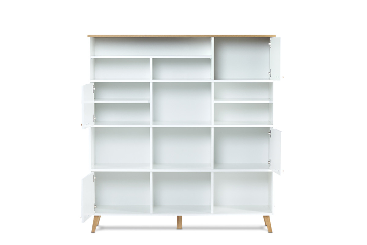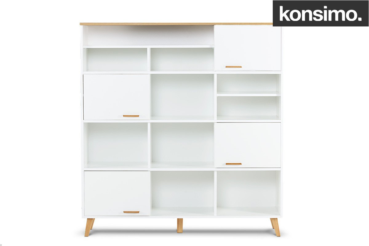 Przechowywanie nie musi być nudne – udowadnia to piękny biały regał ze skandynawskiej kolekcji FRISK. Mnóstwo szerokich półek i praktycznych, zamykanych szafek przechowa i wyeksponuje mniej i bardziej ozdobne elementy domowego wyposażenia. Wygodnie otwierane drzwiczki mocowane zawiasami puszkowymi o wysokiej niezawodności świetnie znoszą nawet intensywną eksploatację. Regał wykonany został z bardzo mocnej płyty – z powodzeniem znosi nawet duże obciążenie.
