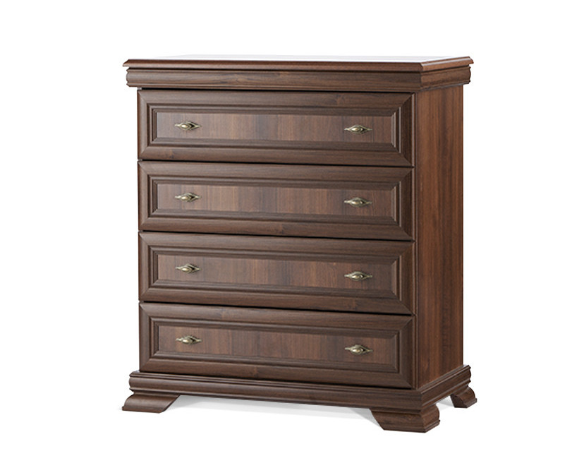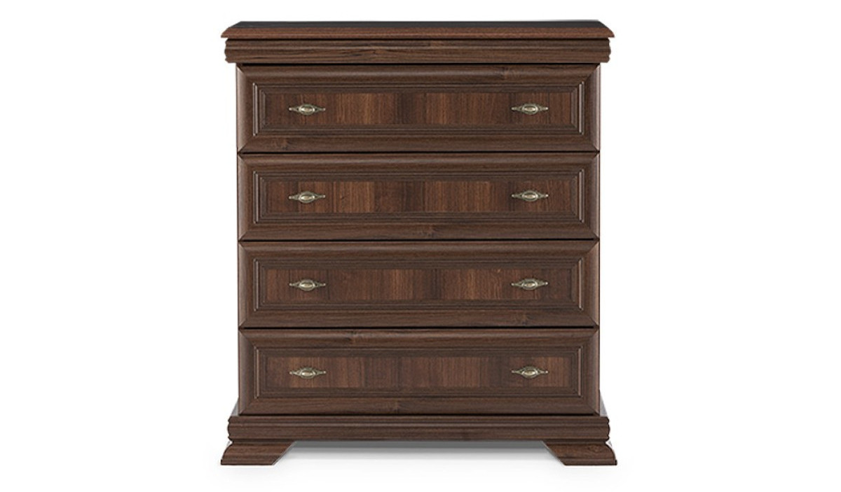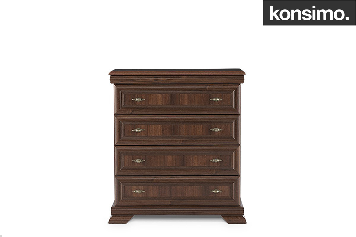 Praktyczna, wygoda – komoda z kolekcji IMPERIO to doskonała propozycja dla zwolenników mebli klasycznych. Elegancja i niepowtarzalny urok idą tu w parze z wysoką jakością. Wykonana z grubej, solidnej płyty, z powodzeniem zniesie nawet duży ciężar. Cztery szerokie, głębokie szuflady pomieszczą ubrania, pościel, obrusy i mnóstwo innych przedmiotów codziennego użytku. Rolkowe prowadnice ułatwiają sprawną obsługę, gwarantując niezawodną pracę szuflad przez cały okres eksploatacji mebla.