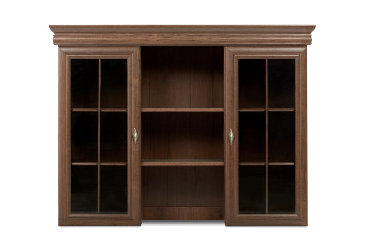 Piękna klasyczna nastawka komody z kolekcji IMPERIO znajdzie zastosowanie w każdym tradycyjnym salonie. Ozdobne listwy, orzechowy kolor i piękne uchwyty podkreślają tradycyjny styl nastawki. Posiada ona pojemne półki, oraz przeszklone drzwi, które pozwolą eksponować wszystkie schowane w niej przedmioty. Nastawka będzie idealnym dodatkiem do komody w salonie, jadalni lub pokoju gościnnym