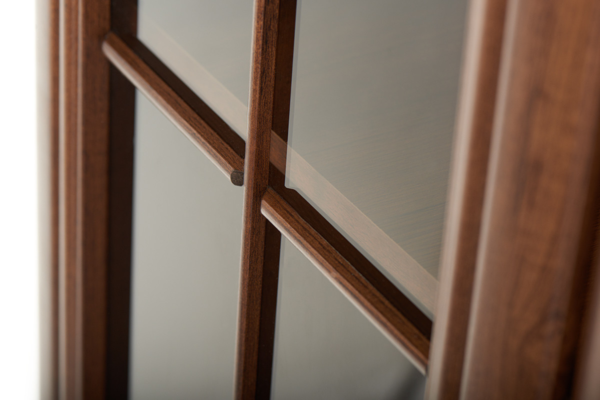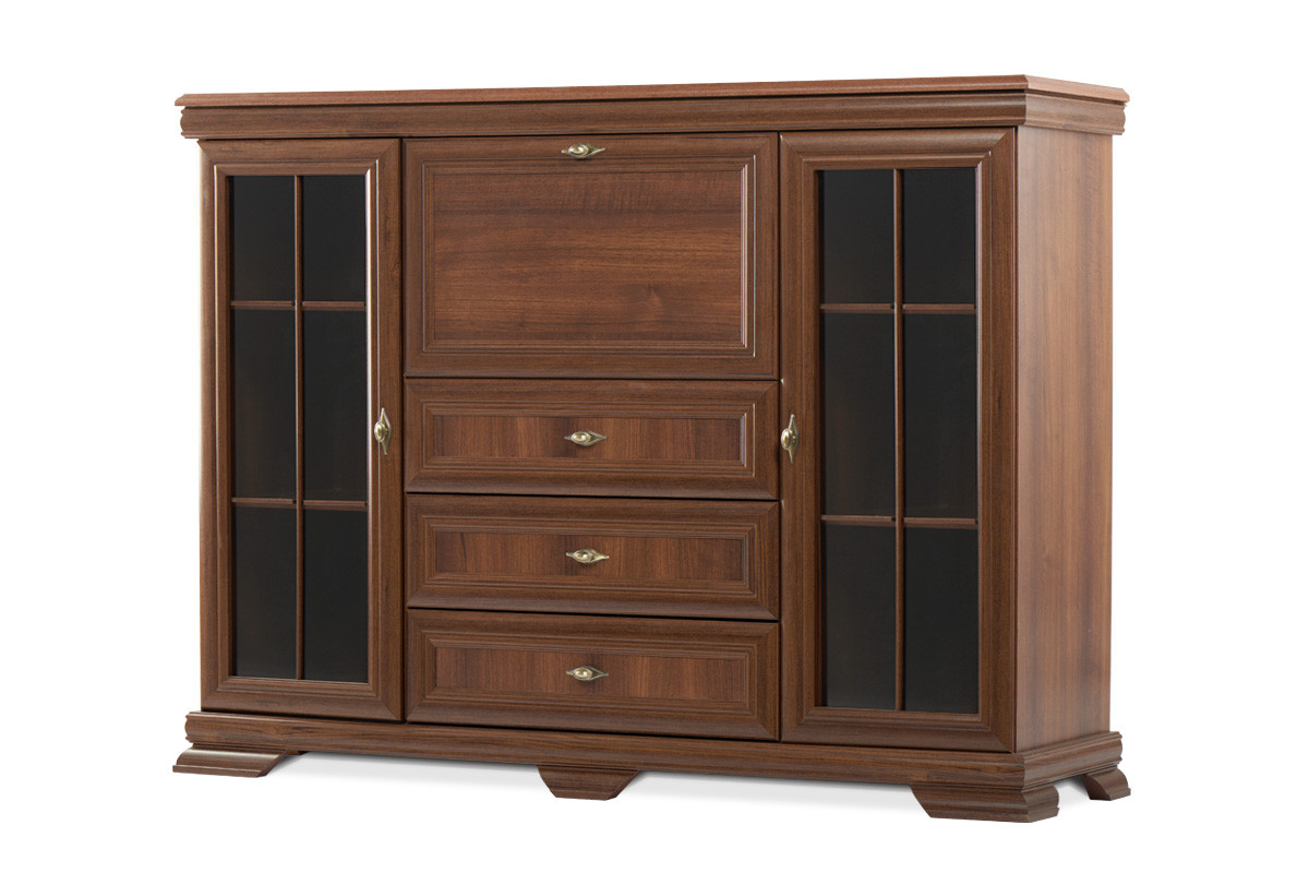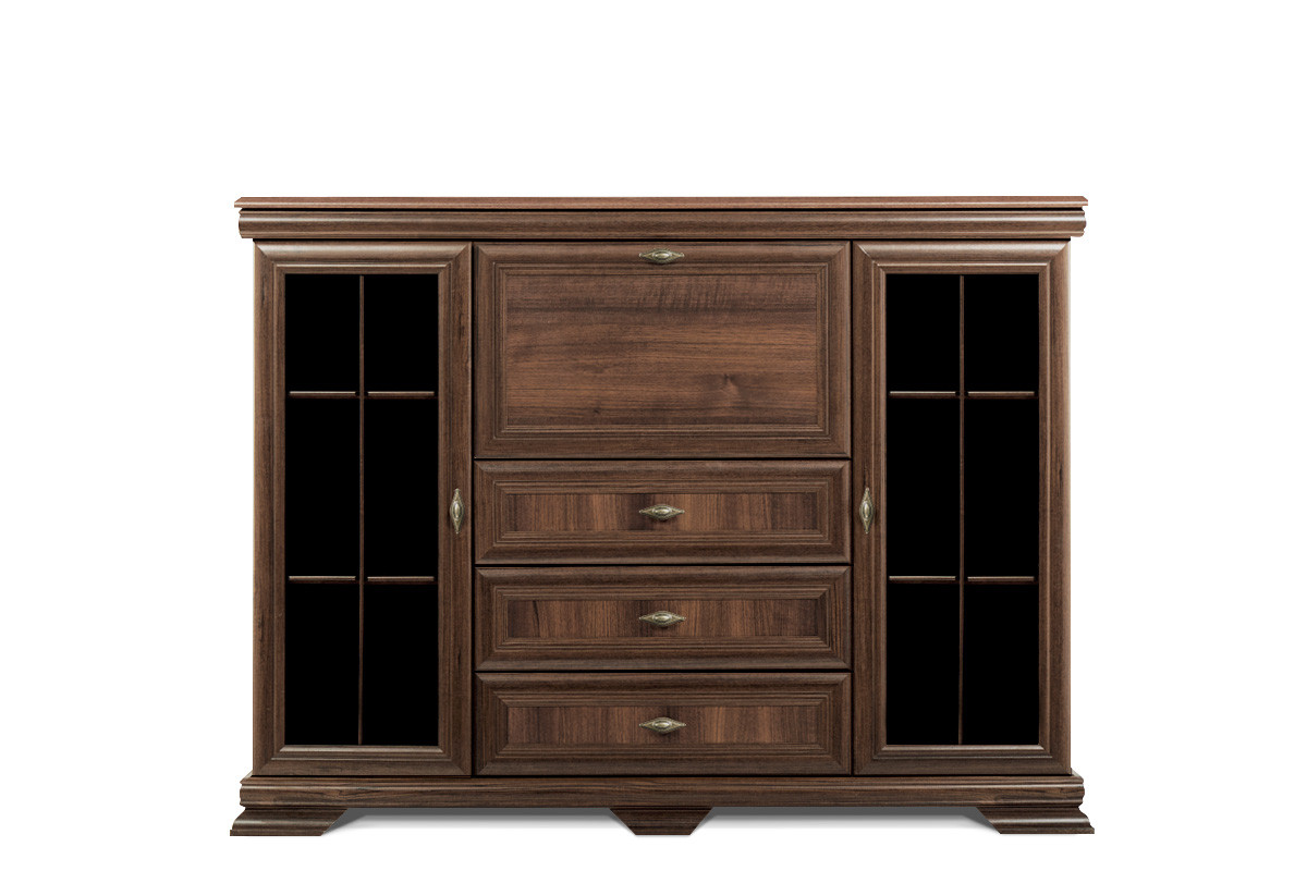 Masywna i solidna, a przy tym wyjątkowo subtelna w swej klasycznej formie, witryna z barkiem z kolekcji IMPERIO doskonale wpasuje się w tradycyjne wnętrze. Piękny orzechowy kolor z laminatem w strukturze drewna wprowadzi wizualnie ciepły i przytulny klimat. Ozdobiona wyjątkowymi dekorami, kunsztownie zaprojektowanymi uchwytami, z masywną podstawą, witryna z barkiem stanie się nie tylko funkcjonalnym elementem, ale też prawdziwą ozdobą w salonie czy jadalni.