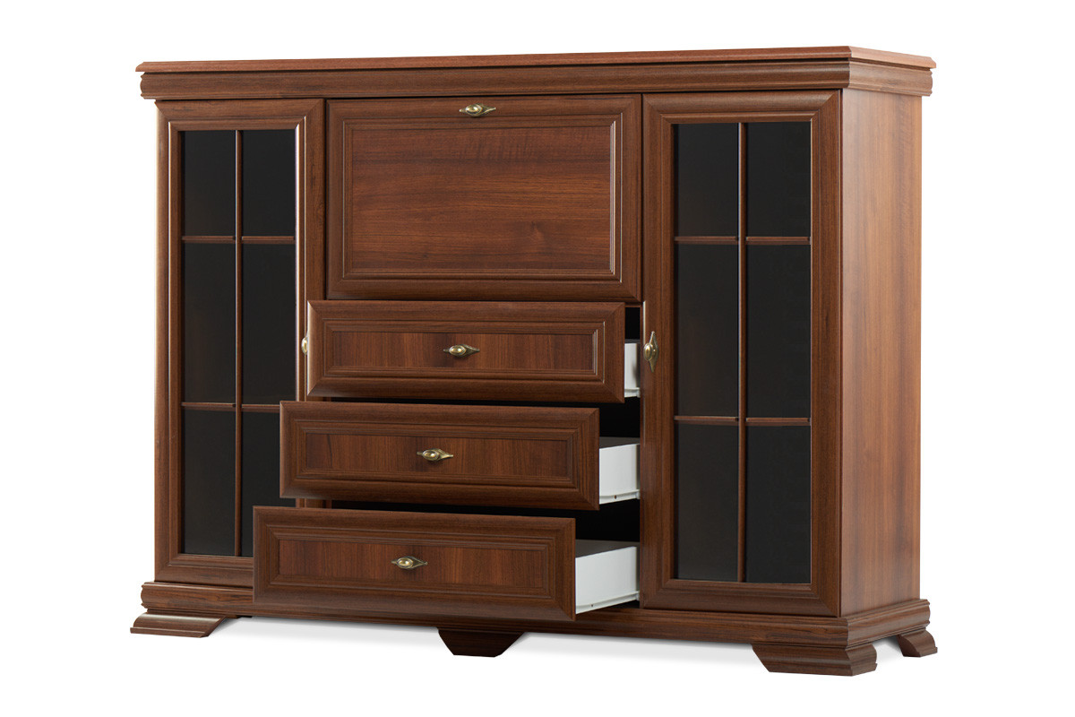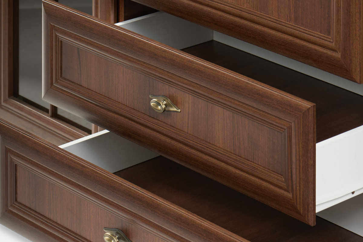 Witryna z barkiem z kolekcji IMPERIO wykonana w eleganckim klasycznym stylu stanie się wyjątkową ozdobą i elementem funkcjonalnym w salonie, jadalni czy pokoju dziennym. Konstrukcja wykonana z solidnej drewnopodobnej płyty zachowuje swój atrakcyjny kształt – z powodzeniem znosi nawet duże obciążenie. Dodatkowo stabilizuje ją specjalne wzmocnienie tylnej ścianki. Trzy pojemne szuflady z rolkowymi prowadnicami przechowają przedmioty codziennego użytku.
