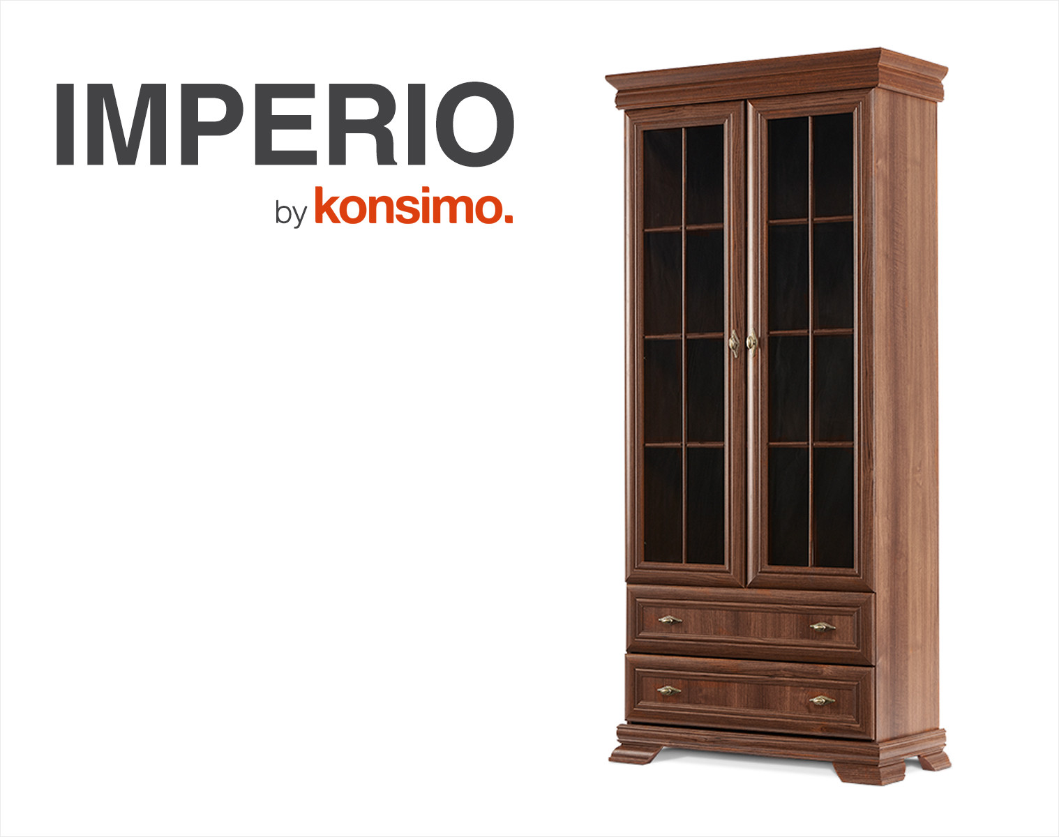 Witryna z kolekcji IMPERIO zachwyci zwolenników klasycznej elegancji. Subtelne, stylizowane ozdobniki, piękne dekory, masywna postawa, ale przede wszystkim ponadczasowa forma – to największe zalety tej wyjątkowej witryny. Dostępna jest w dwóch uniwersalnych kolorach – naturalnym orzechu i estetycznej bieli. Odpowiednio wkomponowana wersja biała sprawdzi się także w innych aranżacjach, na przykład nowoczesnej czy skandynawskiej. Wysokiej jakości laminat doskonale imituje prawdziwe drewno – powierzchnia jest elegancko gładka i łatwa do utrzymania w czystości. To wyjątkowa propozycja dla najbardziej wymagających!