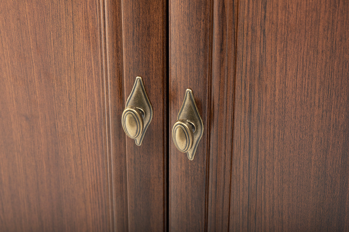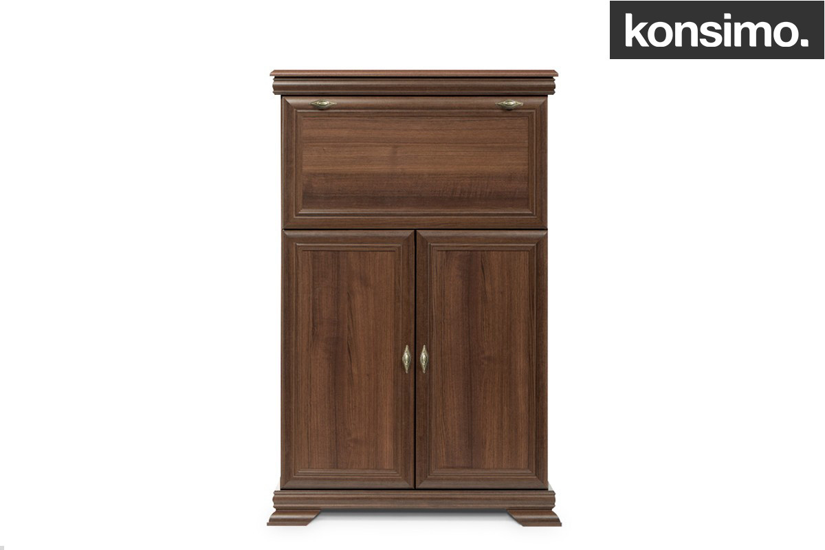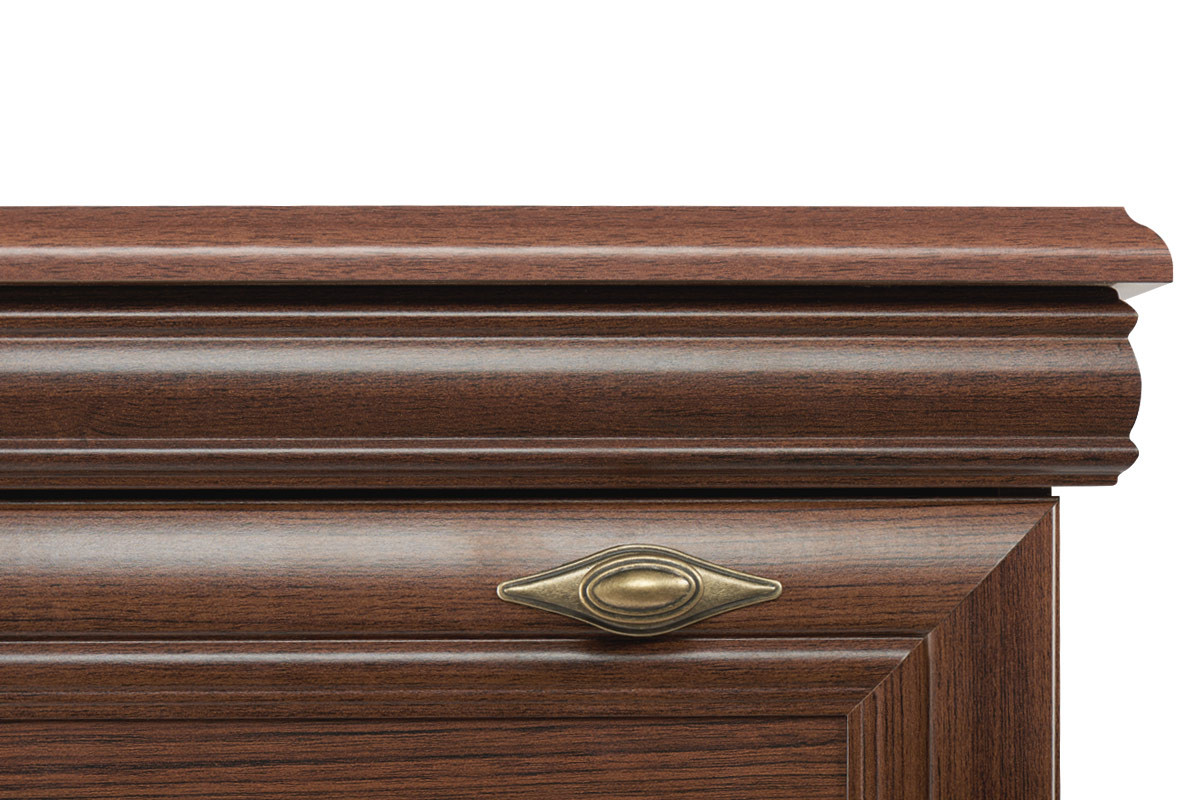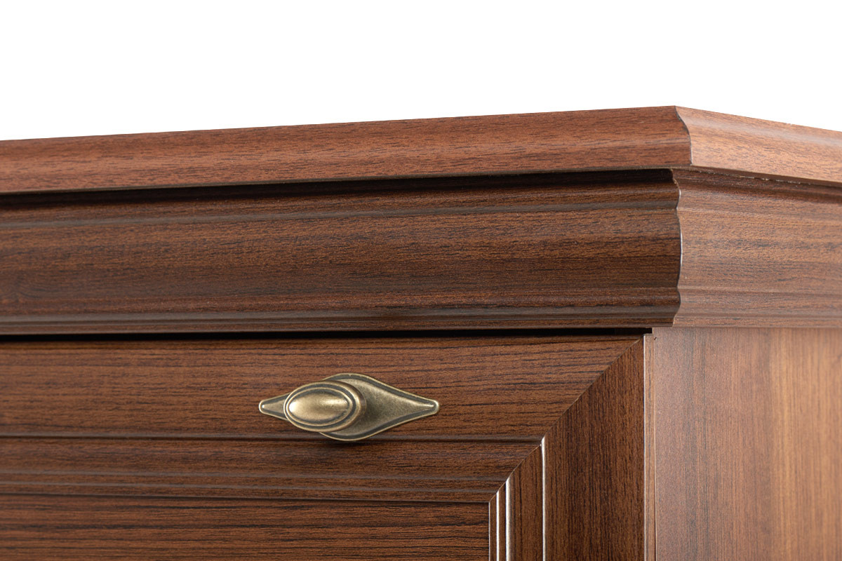 Meble klasyczne świetnie prezentują się samodzielnie i w kompozycjach. Komoda z barkiem z kolekcji IMPERIO samym swoim niepowtarzalnym designem pięknie dekoruje przestrzeń. Ciepły orzechowy kolor dodaje wnętrzu przytulności i wizualnego komfortu. Laminat w strukturze drewna wygląda bardzo elegancko i stylowo, a przy tym jest wolny od wad typowych dla litego drzewa. Całości dodają uroku ozdobne listwy i korony, kunsztownie zaprojektowane uchwyty, masywne nóżki i stylowe dekory. Komoda z barkiem IMPERIO doskonale spełni swoją rolę i pięknie ozdobi klasyczne wnętrze.