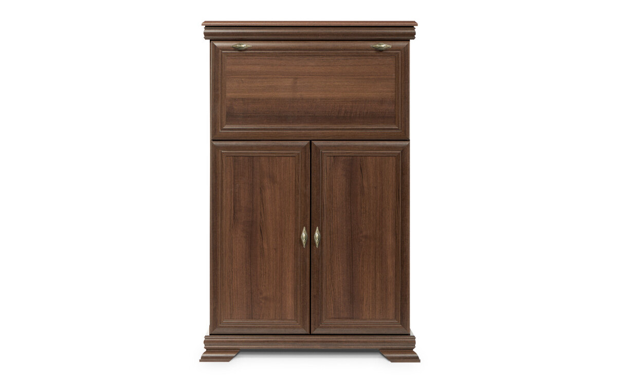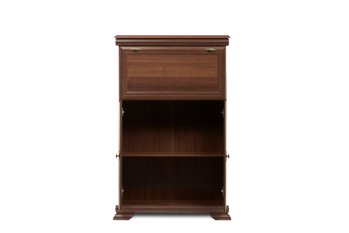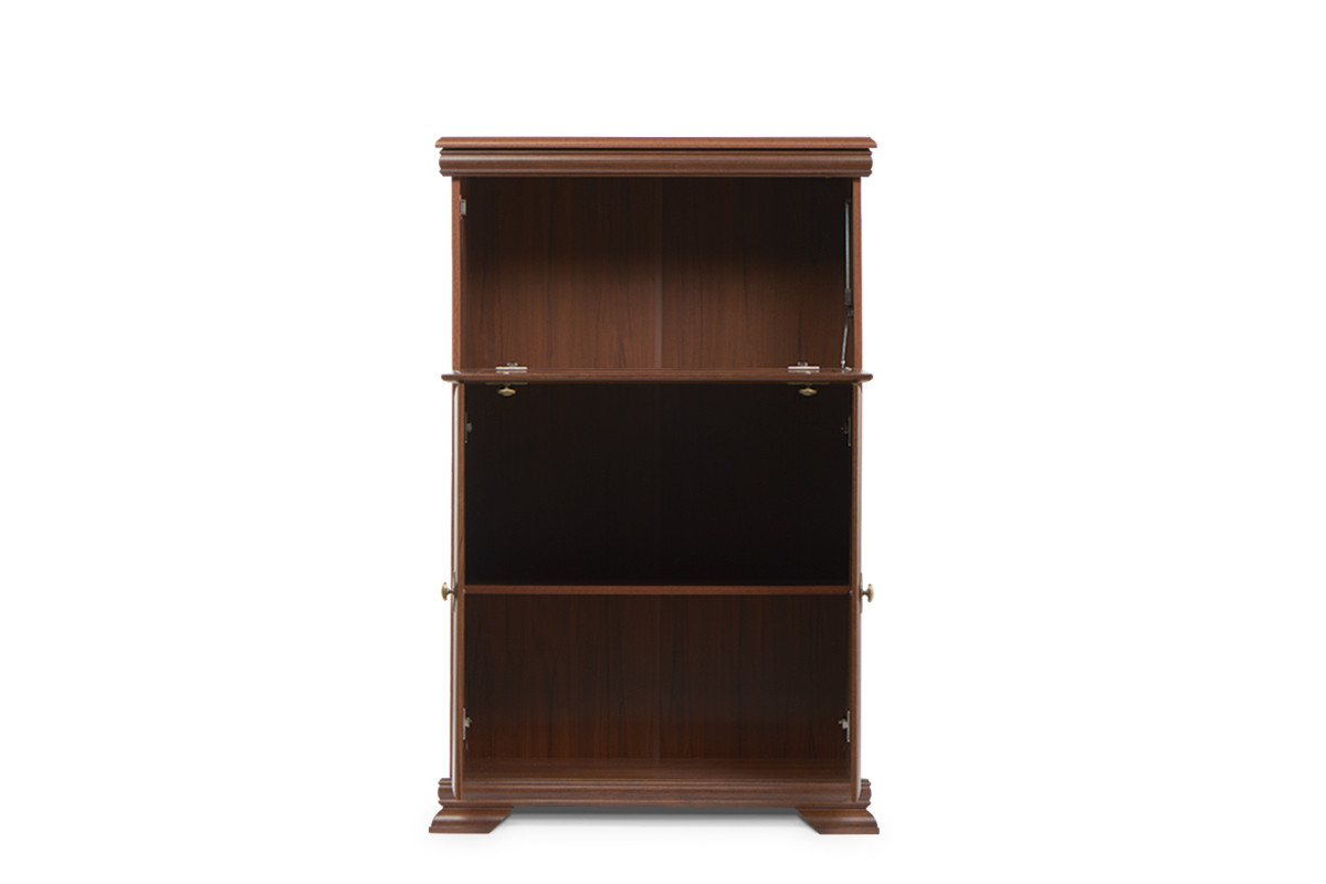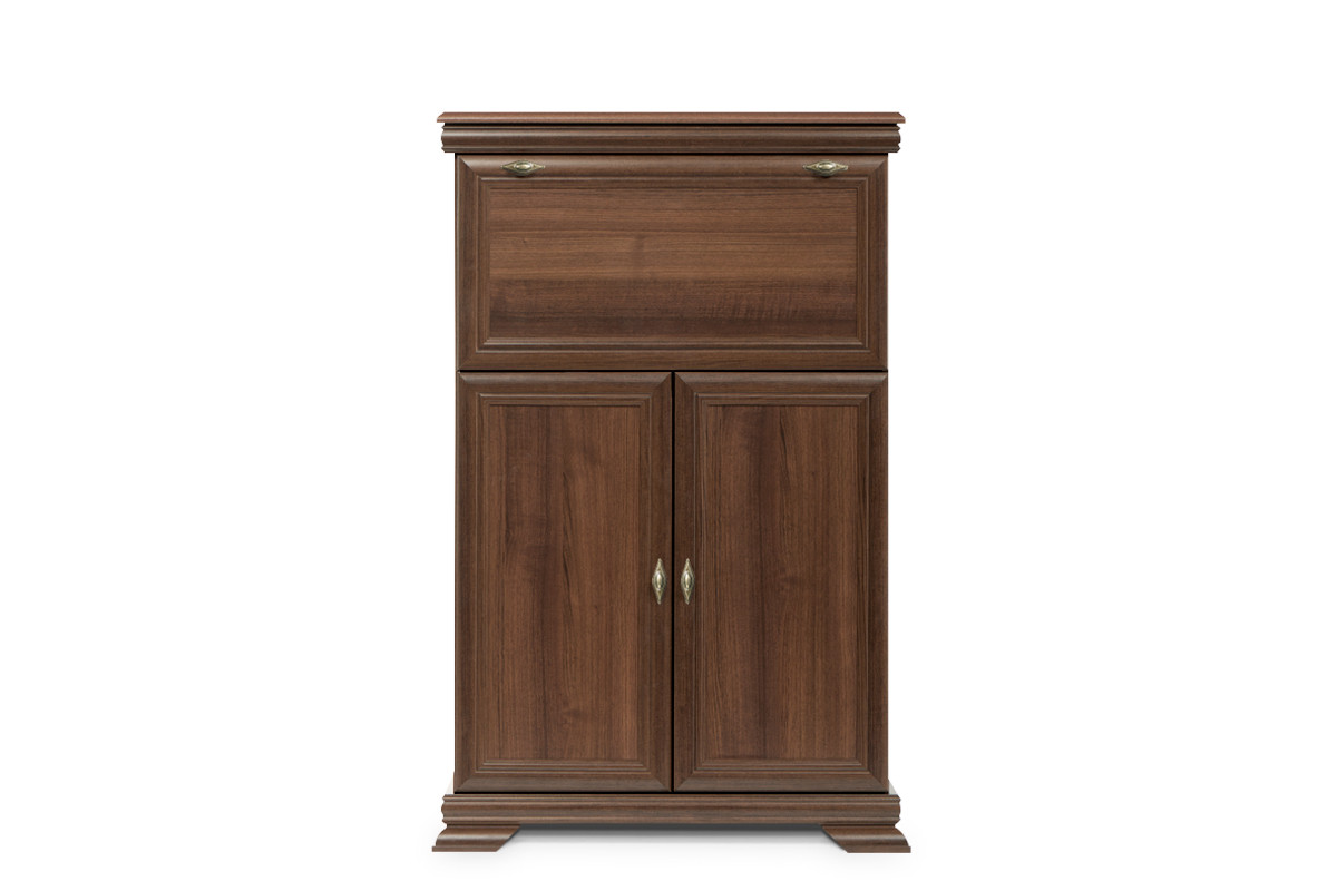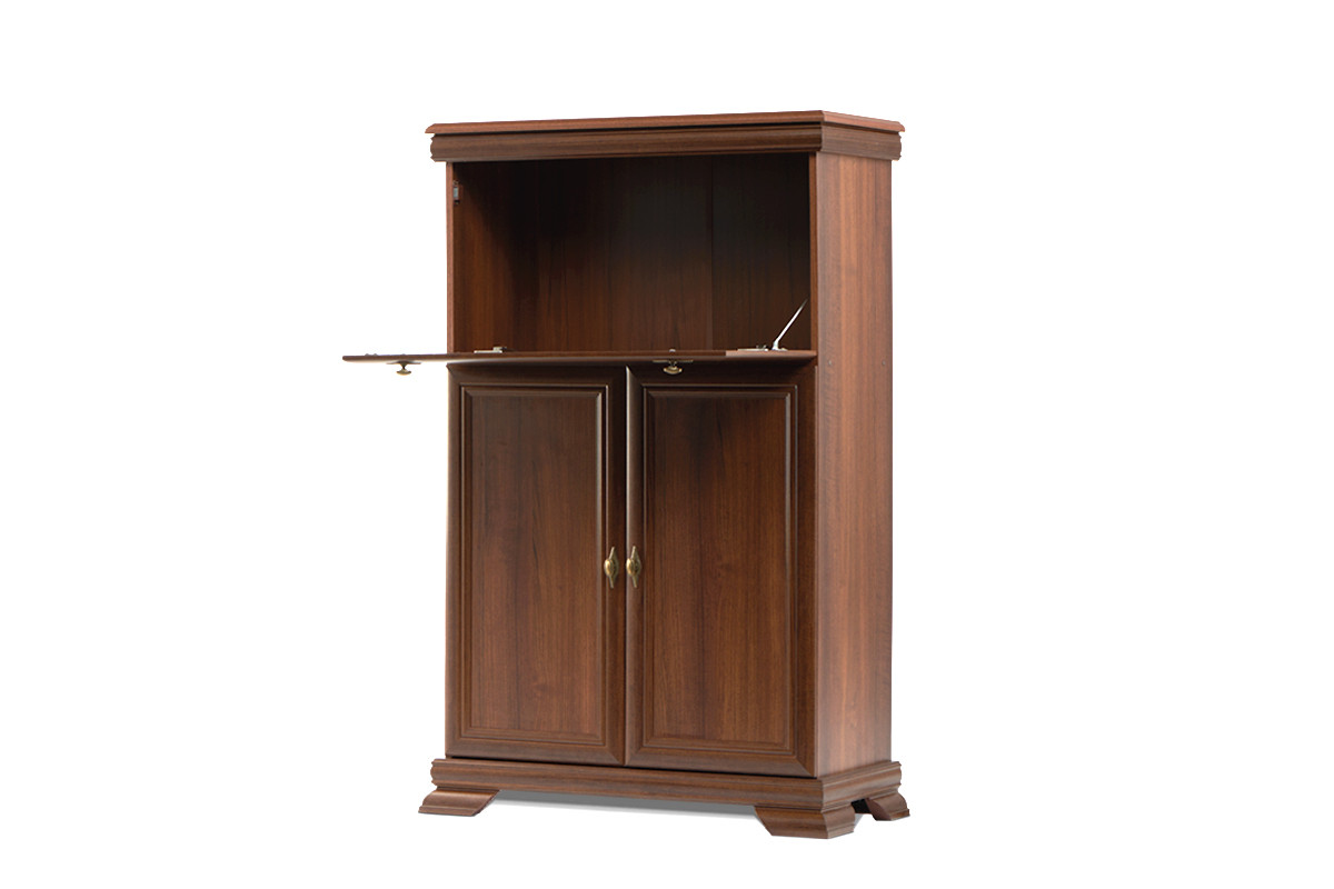 Meble klasyczne świetnie prezentują się samodzielnie i w kompozycjach. Komoda z barkiem z kolekcji IMPERIO samym swoim niepowtarzalnym designem pięknie dekoruje przestrzeń. Ciepły orzechowy kolor dodaje wnętrzu przytulności i wizualnego komfortu. Laminat w strukturze drewna wygląda bardzo elegancko i stylowo, a przy tym jest wolny od wad typowych dla litego drzewa. Całości dodają uroku ozdobne listwy i korony, kunsztownie zaprojektowane uchwyty, masywne nóżki i stylowe dekory. Komoda z barkiem IMPERIO doskonale spełni swoją rolę i pięknie ozdobi klasyczne wnętrze.