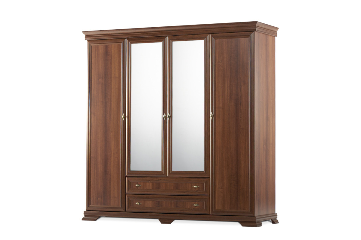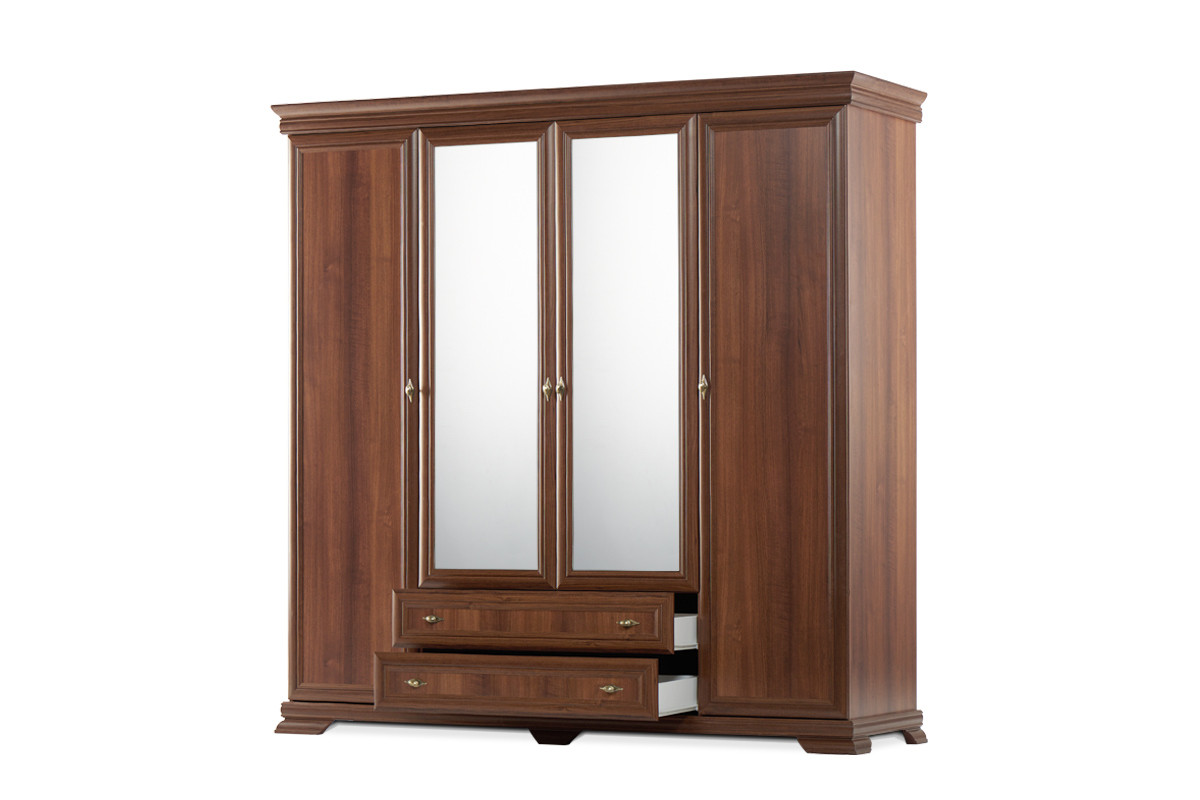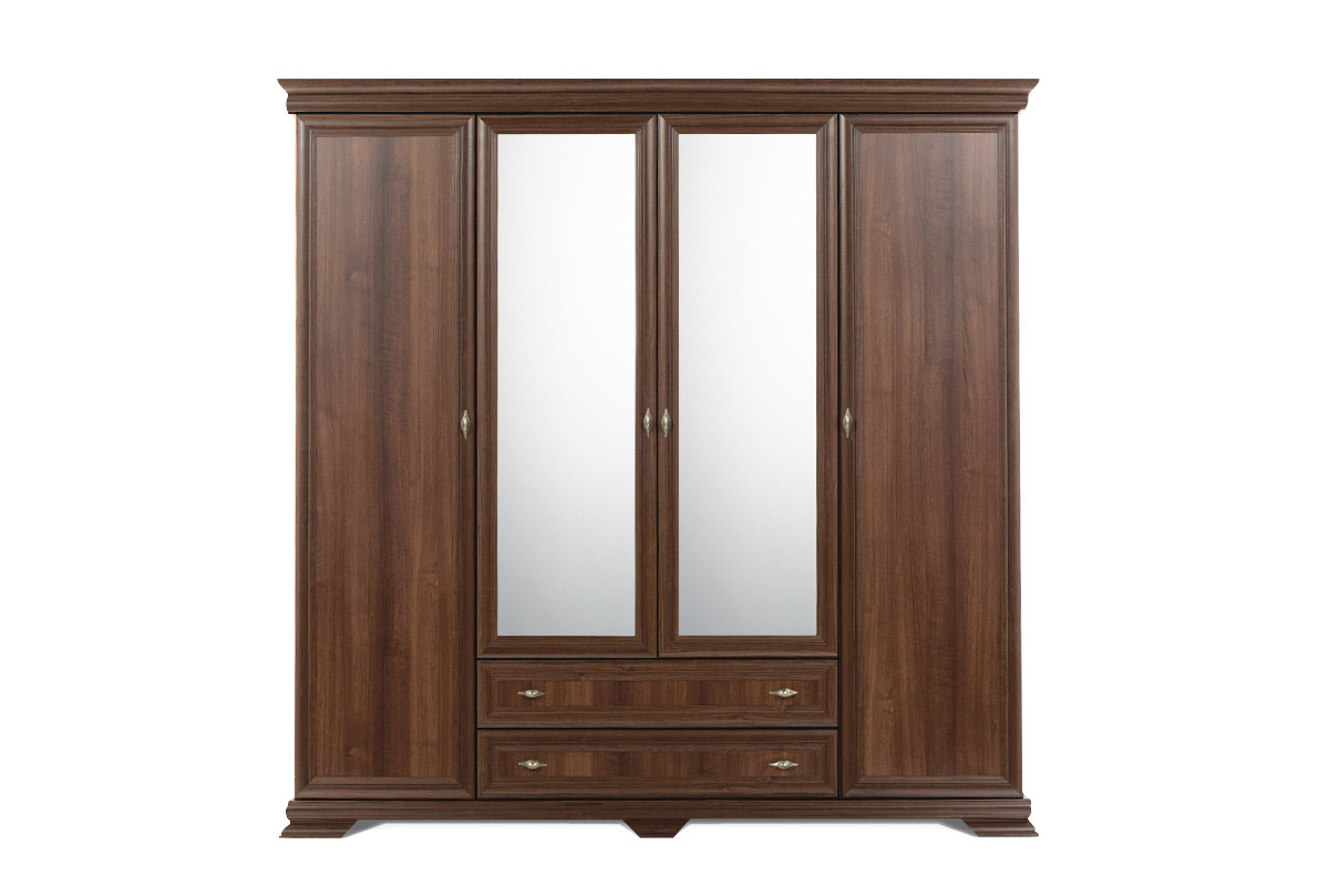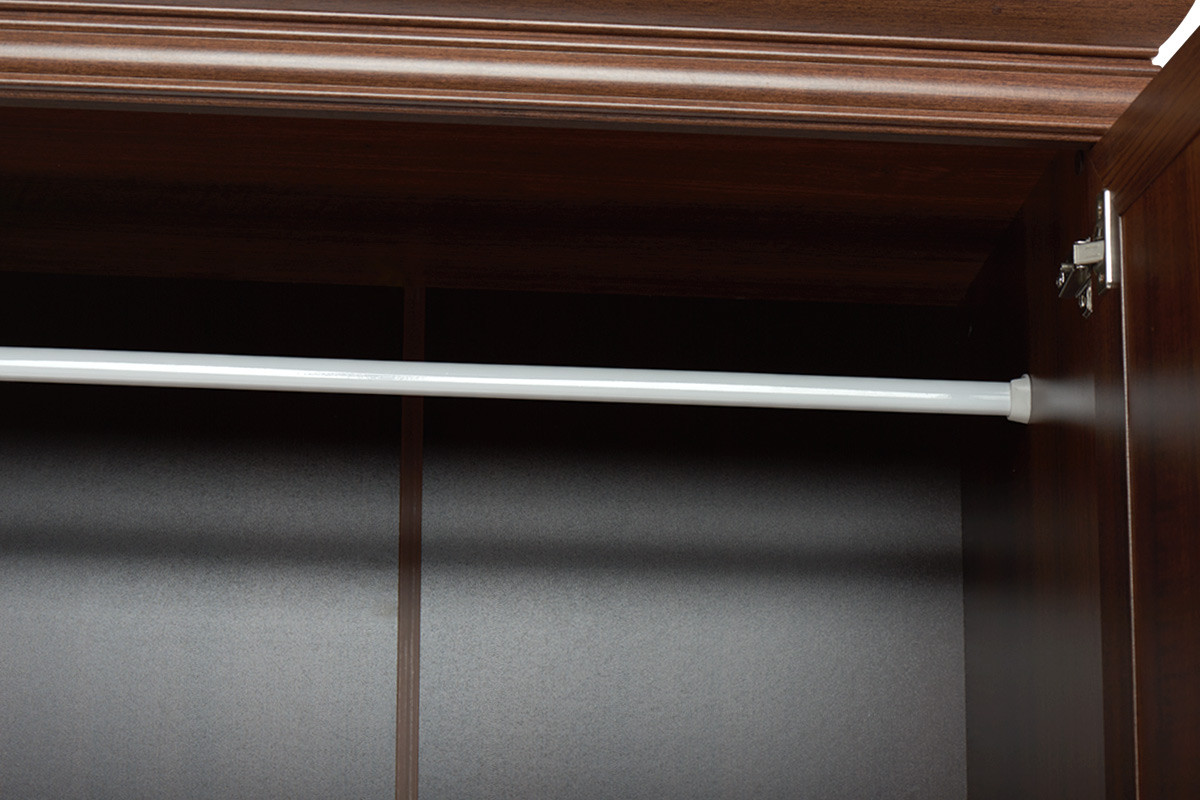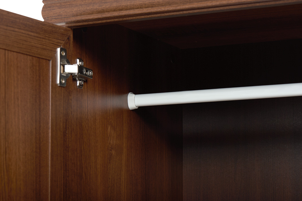 Zaprojektowana w uniwersalnym klasycznym stylu, szafa ubraniowa z kolekcji IMPERIO pomieści nawet pokaźną garderobę. Mnóstwo miejsca na wygodnych, solidnych półkach, pokaźna szafa z drążkiem na wieszaki, szerokie lustra, a także głębokie i pojemne szuflady z rolkowymi prowadnicami – wszystko to sprawia, iż ta funkcjonalna szafa ubraniowa spełni oczekiwania nawet najbardziej wymagających.