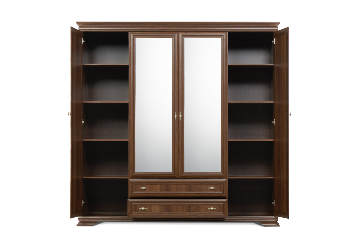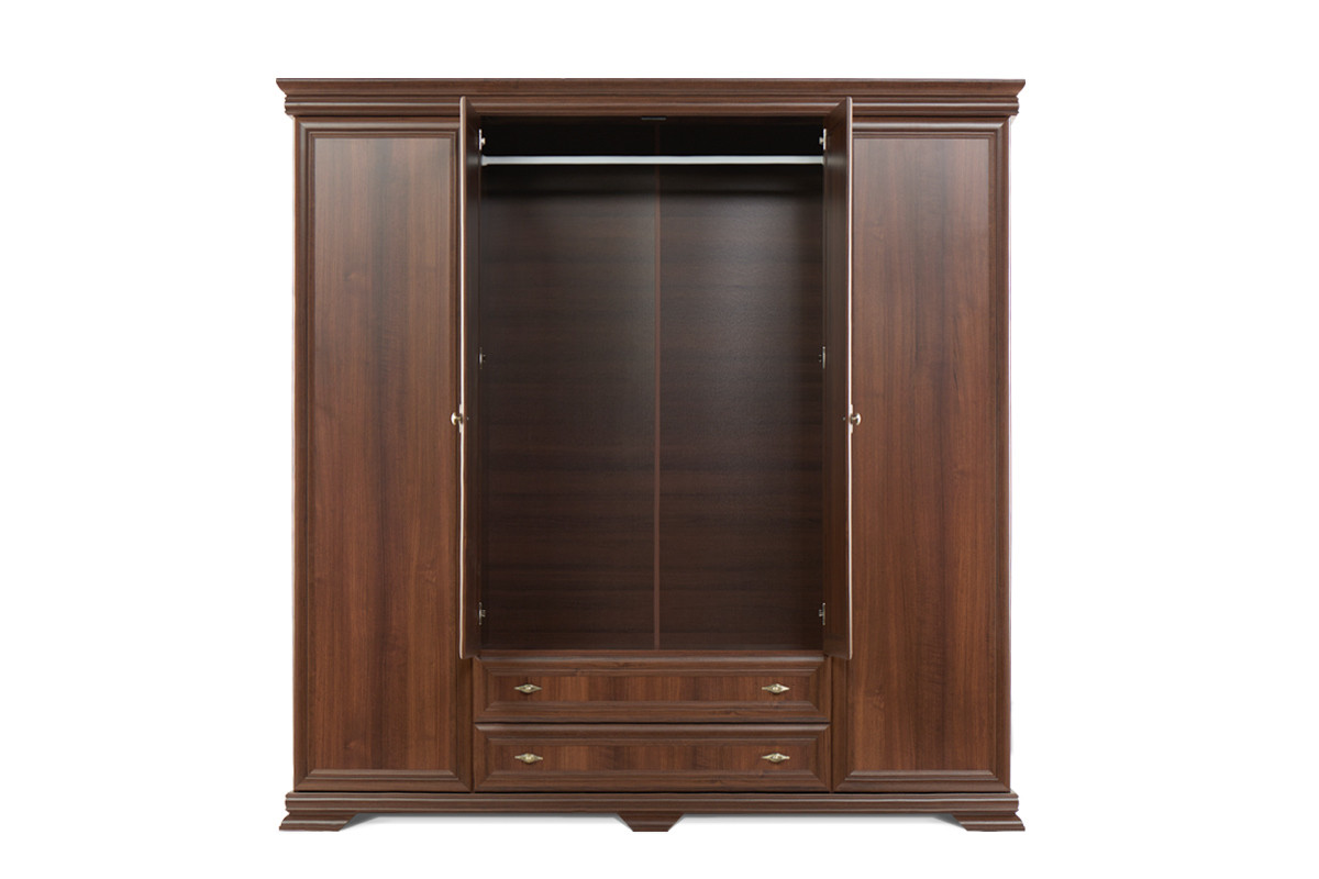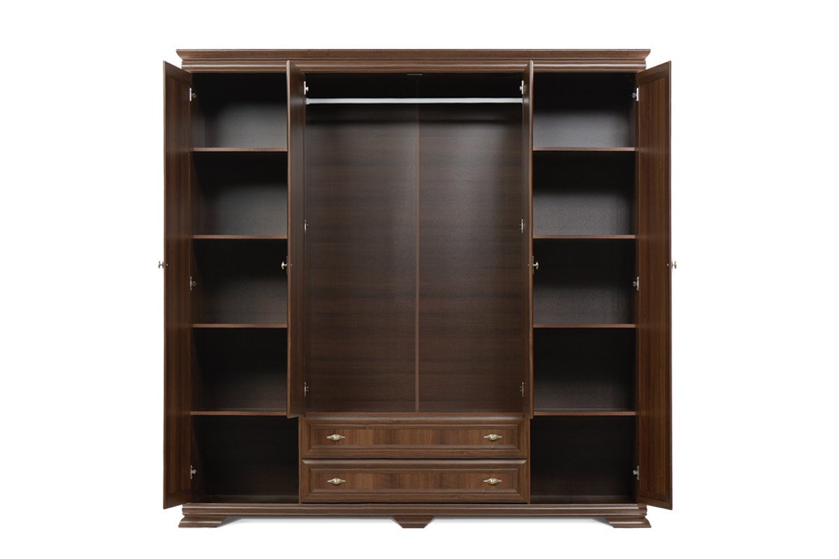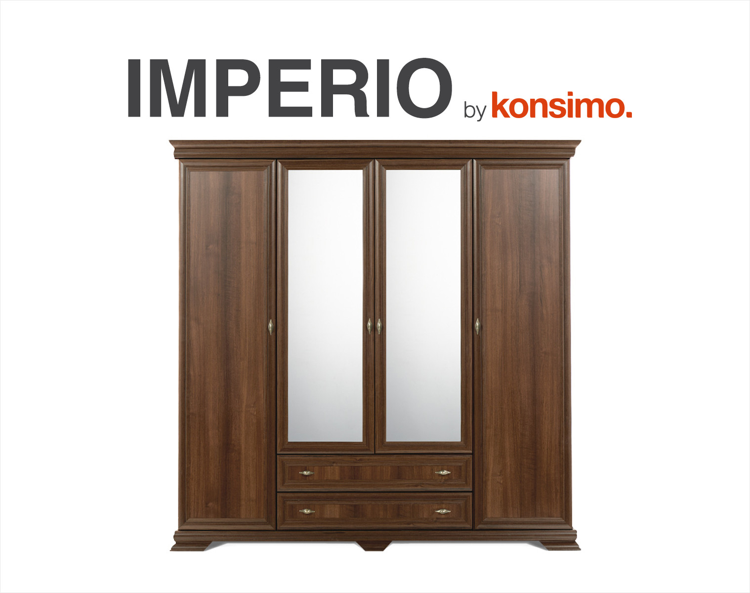 Zaprojektowana w uniwersalnym klasycznym stylu, szafa ubraniowa z kolekcji IMPERIO pomieści nawet pokaźną garderobę. Mnóstwo miejsca na wygodnych, solidnych półkach, pokaźna szafa z drążkiem na wieszaki, szerokie lustra, a także głębokie i pojemne szuflady z rolkowymi prowadnicami – wszystko to sprawia, iż ta funkcjonalna szafa ubraniowa spełni oczekiwania nawet najbardziej wymagających.