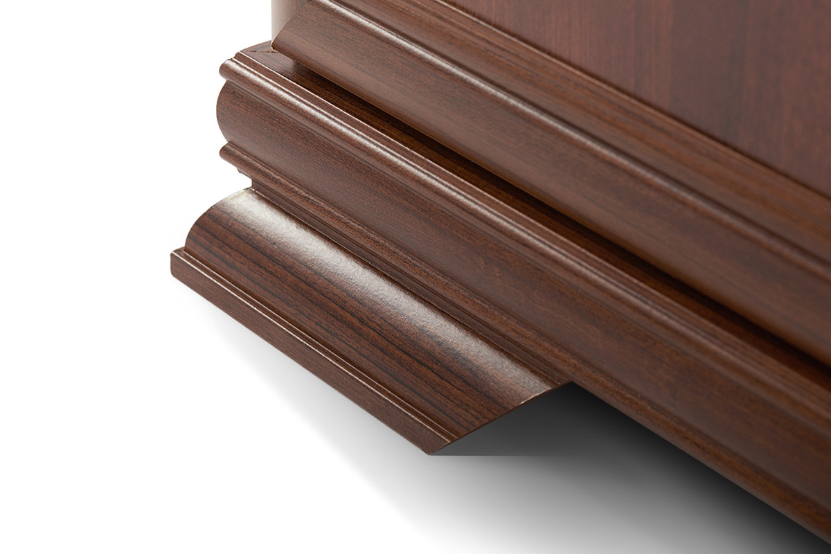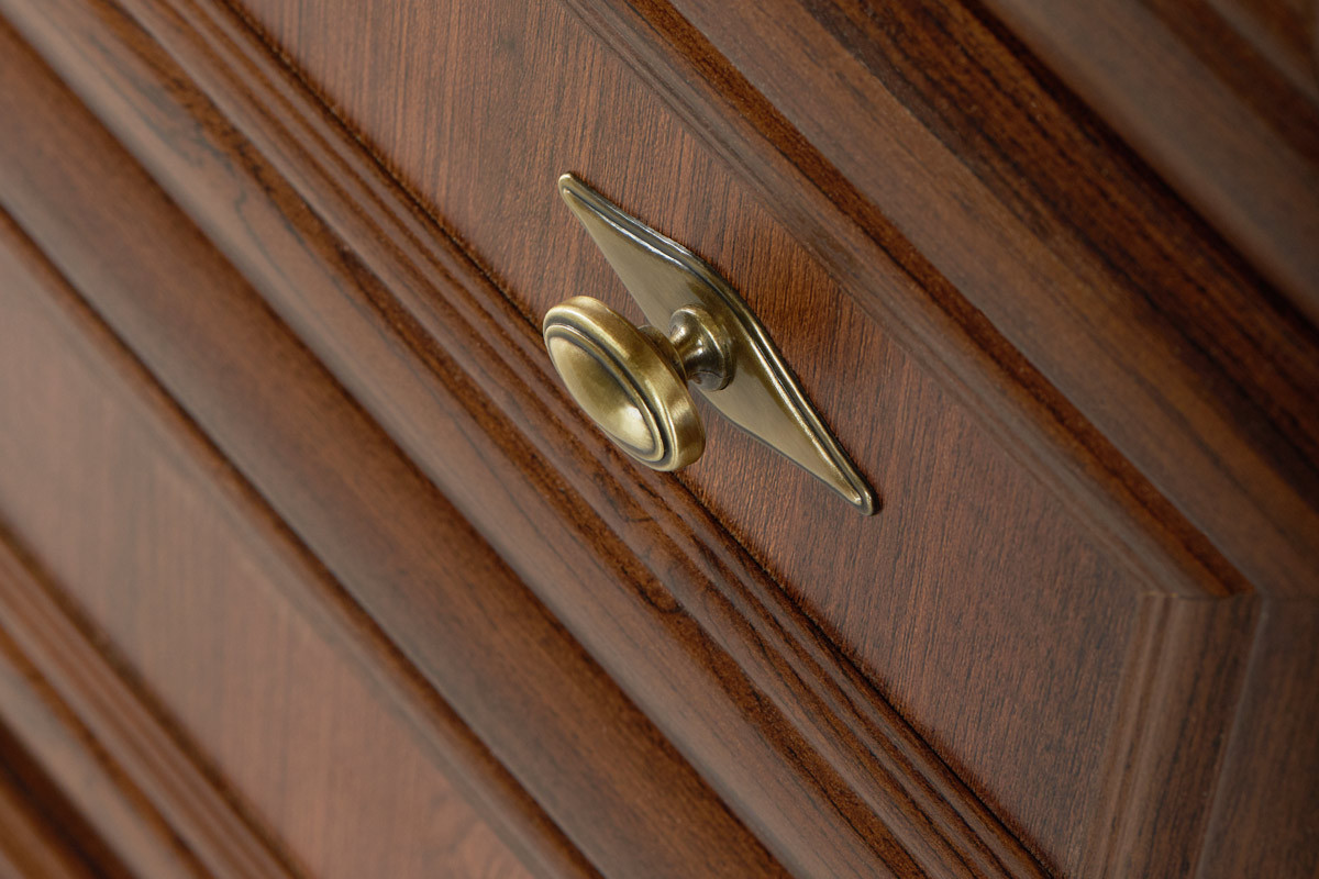 Wytrzymałe materiały z powodzeniem znoszą nawet duże obciążenie i intensywne użytkowanie. Konstrukcja została wykonana z grubej płyty laminowanej w strukturze drewna – eleganckiej i łatwej do utrzymania w czystości. Szafa świetnie prezentuje się w pojedynkę lub z innymi meblami klasycznymi.
