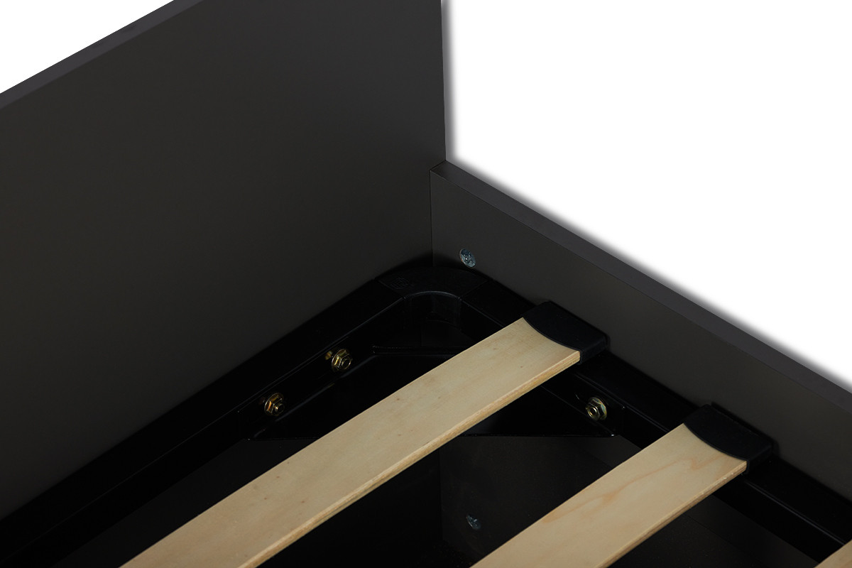Rama łóżka dziecięcego z kolekcji SHIBU wykonana została z mocnej płyty meblowej, dzięki czemu z powodzeniem znosi nawet intensywną eksploatację. Zaprojektowane z myślą także o najmłodszych, to nowoczesne łóżko jest bezpieczne i wytrzymałe. Praktyczna szuflada z uchwytem pomieści pościel, ubrania czy zabawki. Dodatkową przestrzeń do przechowywania zapewnią dwie niewielkie komory po bokach szuflady.