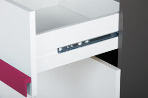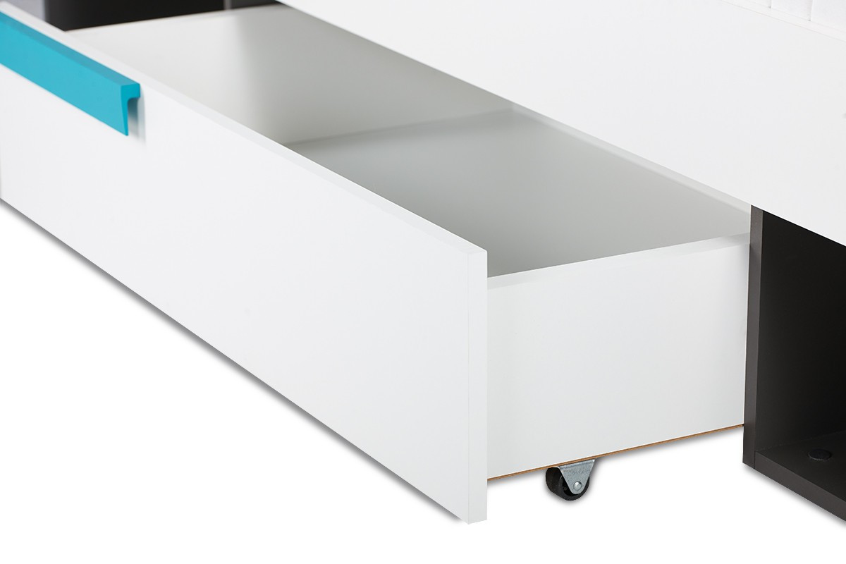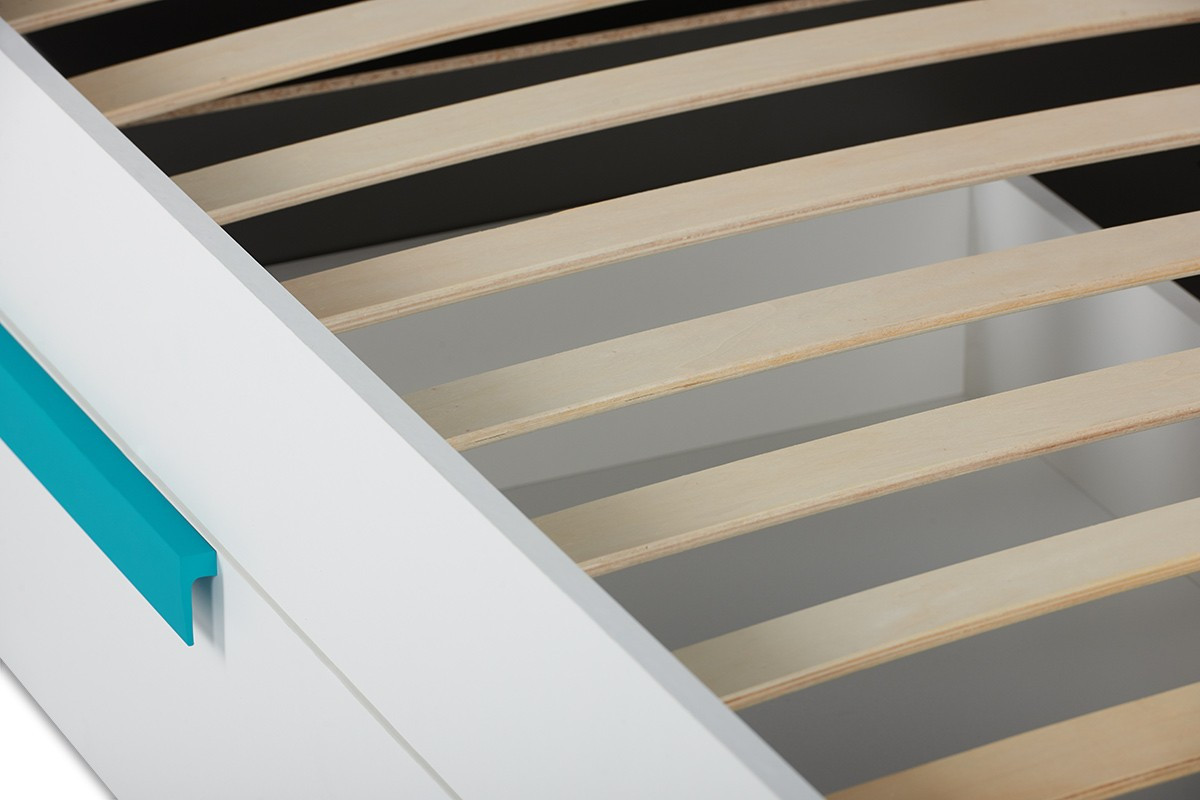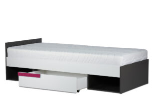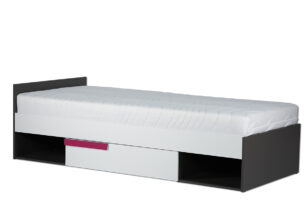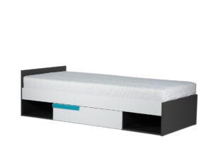 Świetnej jakości drewnopodobny laminat jest dostępny w dwóch wersjach kolorystycznych, a prosta konstrukcja oraz geometryczny uchwyt podkreślają modny i nowoczesny styl łóżka. Pojemne półki i jedna szuflada bez najmniejszego problemu pomieszczą pościele, poduszki oraz inne dziecięce akcesoria, pomagając utrzymać porządek w pokoju naszej pociechy.
