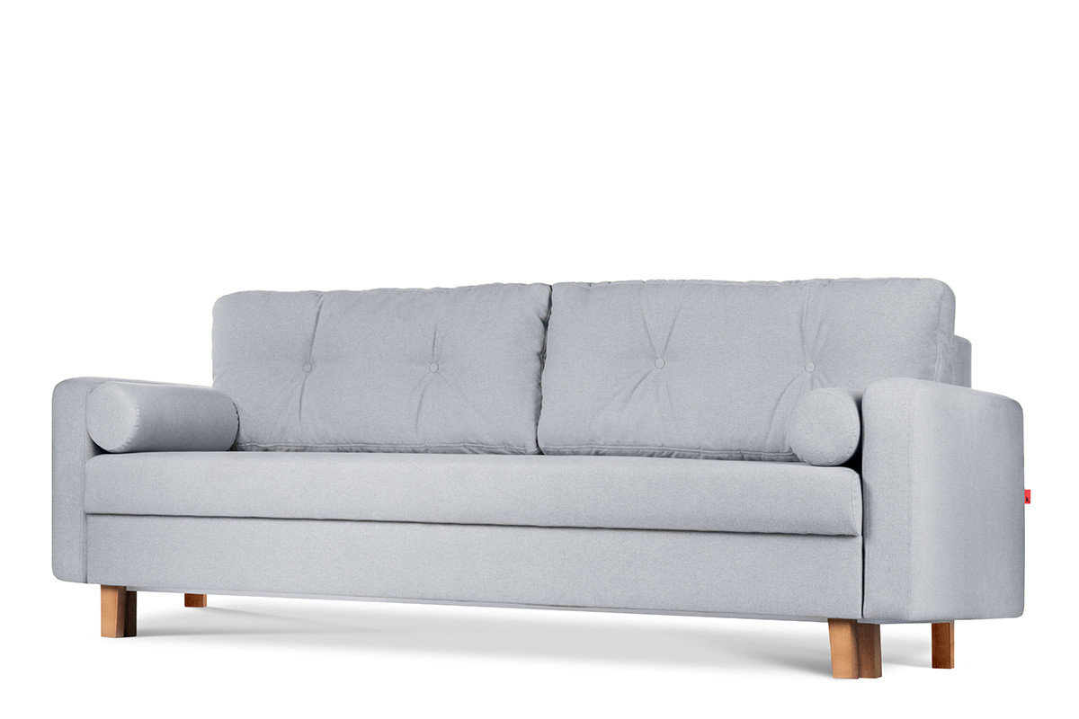 Dwie poduszki oparciowe i dwie dekoracyjne podnoszą komfort użytkowania tej nowoczesnej sofy. Dzięki suwakom ukrytym w estetycznych tunelach pokrowce można łatwo zdjąć i szybko uprać. Komfort zapewnia średnio twarde siedzisko z listwy sprężynowej, ovaty i pianki poliuretanowej. Ta nowoczesna skandynawska kanapa sprawi, że wszyscy poczują się zrelaksowani i swobodni!Skandynawska, trzyosobowa sofa ERISO to znakomita propozycja dla wszystkich ceniących sobie meble najwyższej jakości oraz ich niepowtarzalną estetykę. Materiał, z którego została wykonana, jest przyjemny w dotyku, co gwarantuje komfort wypoczynku oraz snu – kanapę można rozłożyć, dzięki czemu zyskujemy dodatkową przestrzeń do spania. Piękny kolor tapicerki i skandynawski styl idealnie dopełni każde wnętrze, swoim niepowtarzalnym charakterem. Świetnie wpisze się w minimalistyczny wystrój salonu. Drewniane nóżki i materiał najwyższej jakości dodają sofie Eriso elegancji i podkreślają jej skandynawski styl. Cała konstrukcja jest stabilna, a mebel wytrzymały, dzięki czemu powinien długo służyć. Tapicerka jest częściowo odporna na zabrudzenia, a samo czyszczenie nie powinno stanowić większych problemów. Rozkładana sofa posiada dużą powierzchnię spania (na której swobodnie mogą zasnąć dwie osoby) oraz pojemnik na pościel. Sofa Eriso jest idealnym wyborem do salonu, sypialni czy pokoju dziennego.