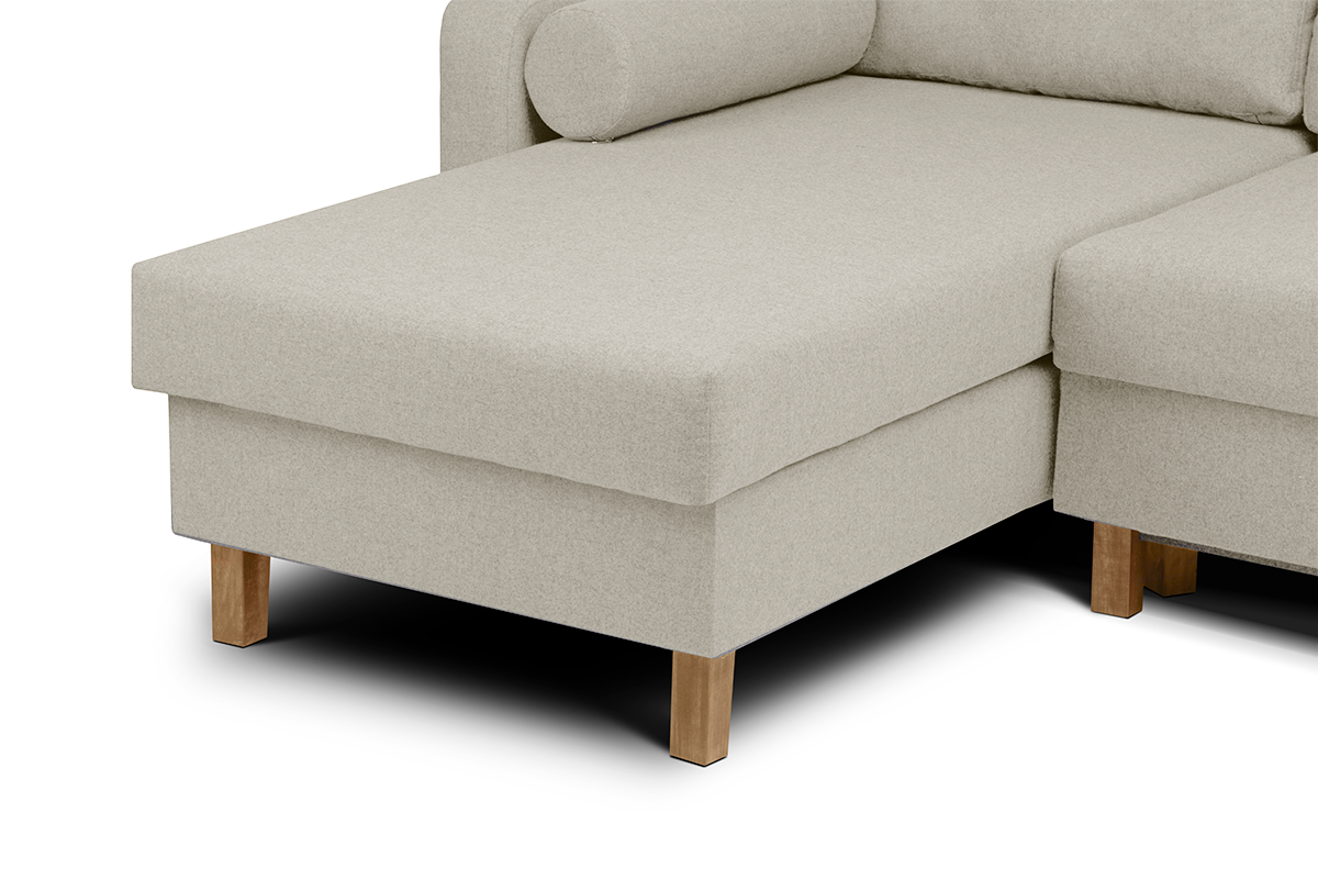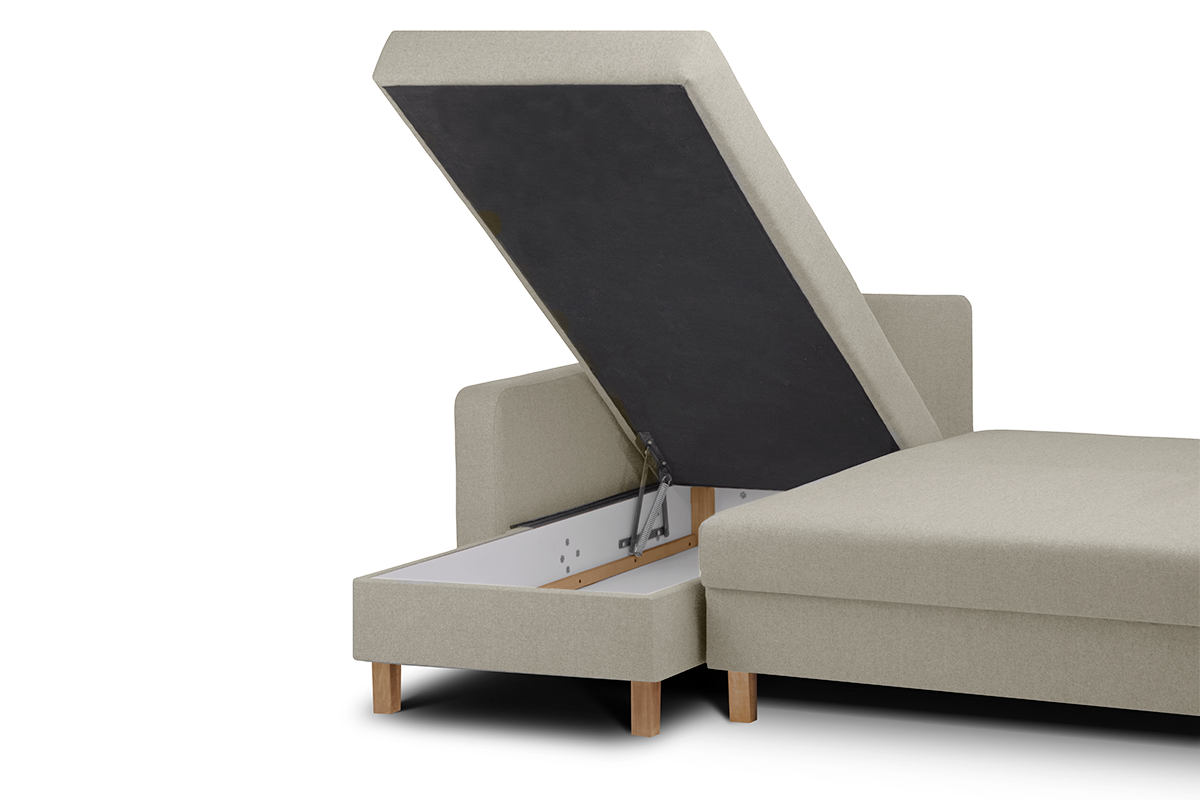 Duży pojemnik na pościel z wywietrznikami pomieści wszystko, co trzeba schować w dzień, a co potrzebne jest w nocy. Wysokiej jakości tkanina pleciona wyróżnia się odpornością na ścieranie i uszkodzenia, a do tego jest łatwa do utrzymania w czystości. Poduszki oparciowe i dekoracyjne posiadają suwaki w tunelach, dzięki którym pokrowce można łatwo zdjąć i uprać. Ten funkcjonalny narożnik skandynawski jest wyjątkowo wygodny i praktyczny – sprawdzi się nie tylko w domu, ale też w hotelu czy poczekalni.