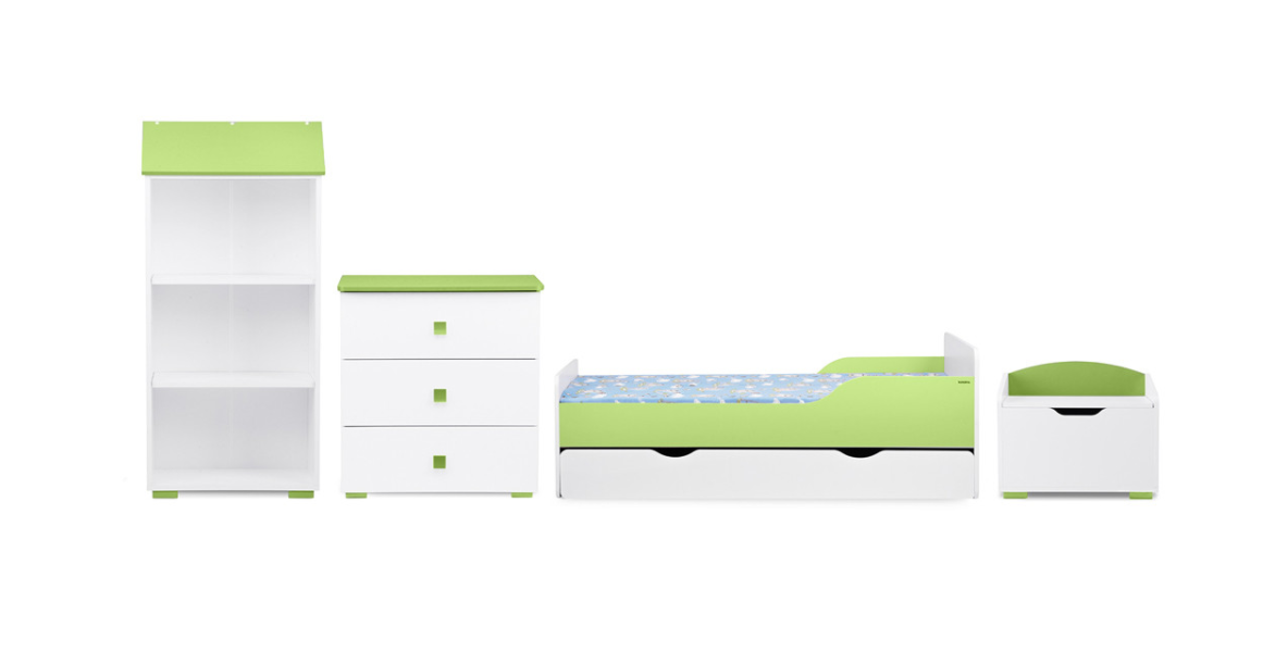 Wykonane z wytrzymałych, solidnych materiałów, meble dziecięce PABIS trafią w potrzeby zarówno przedszkolaków, jak też młodszych i starszych uczniów. W skład zestawu wchodzi regał, komoda, kontenerek na zabawki oraz wygodne łóżko z szufladą na pościel. Trzy głębokie szuflady w komodzie, trzy półki regału i pojemny kontenerek zapewniają przestrzeń do przechowywania dziecięcych ubrań, zabawek, książek i wielu innych przedmiotów codziennego użytku.