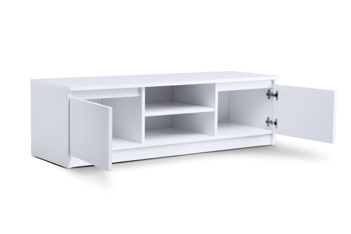 Nowoczesna szafka RTV z kolekcji CRAMBUS została zaprojektowana dla osób ceniących meble o minimalistycznym designie. Prosta forma szafki oferuję wyjątkową funkcjonalność. Dwie półki umożliwiają ułożenie sprzętu RTV, a półki z drzwiami pozwalają schować dodatkowy sprzęt. Szeroki blat zapewni stabilne ułożenie telewizora. Szafka RTV CRAMBUS doskonale dopełni każdy nowoczesny salon, pokój dzienny czy pokój gościnny.