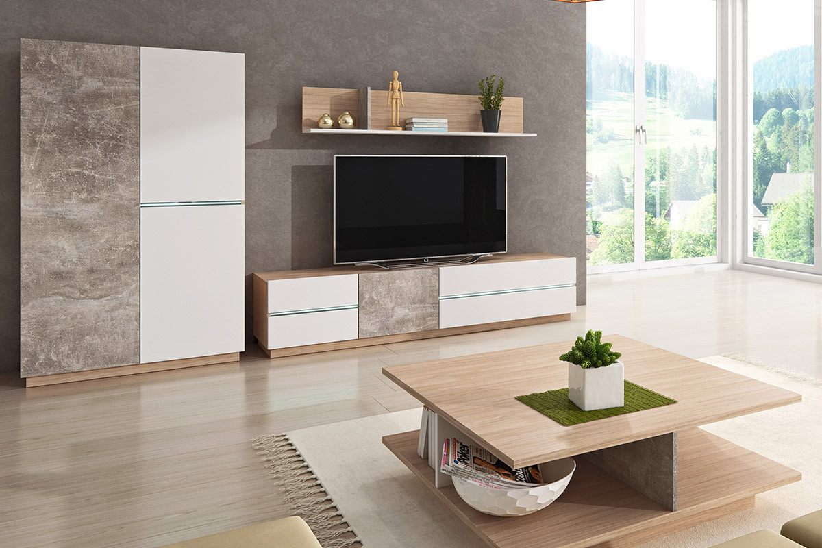 - Materiał frontów: płyta wiórowa laminowana, drewnopodobna 16 mm, szkło