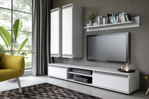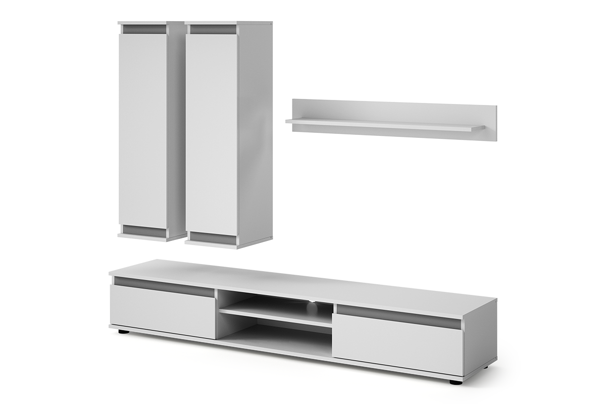 Nowoczesna meblościanka z kolekcji DALIS jest propozycją dla osób ceniących minimalistyczny design oraz prostą formę. Meble bez uchwytów świetnie wpisują się w nowoczesną stylistykę, a jednocześnie są wysoce funkcjonalne – pojemne regały i szuflady pozwalają przechowywać wiele rzeczy codziennego użytku. W skład zestawu wchodzą dwie większe szafki wiszące, półka wisząca oraz szafka RTV.