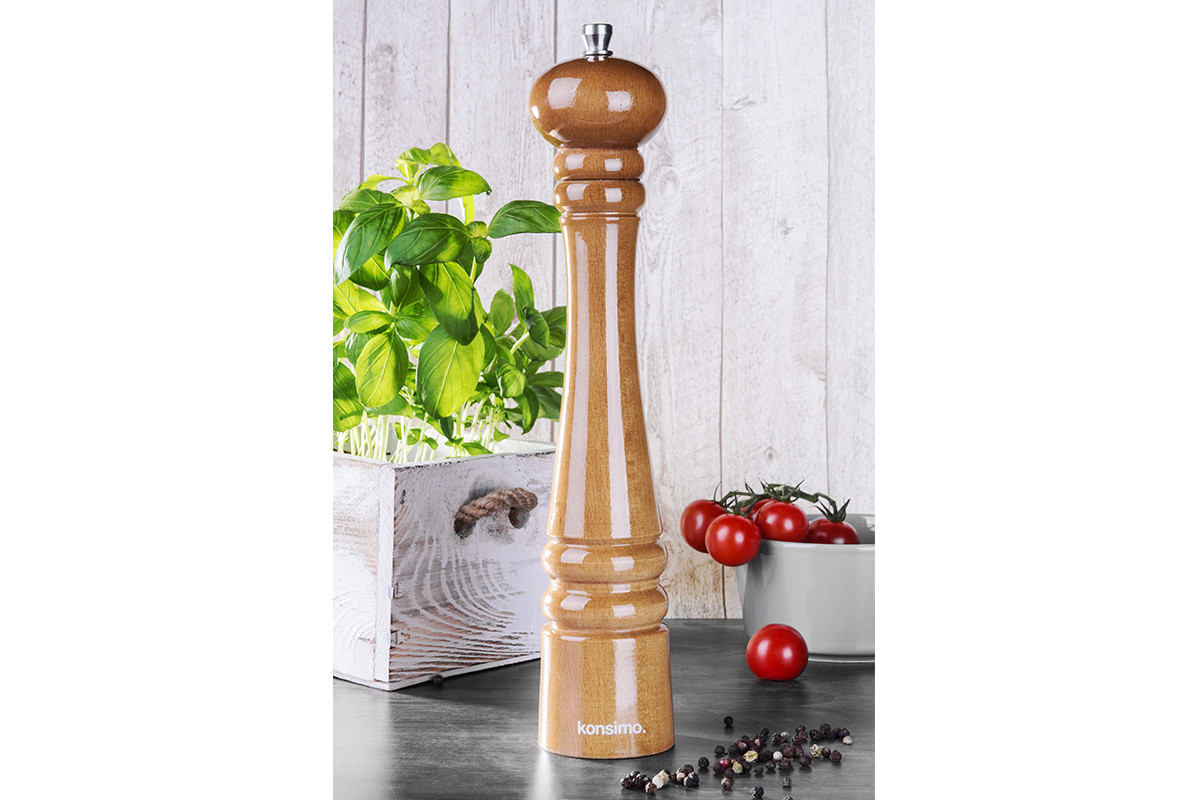 - Dodatkowe informacje: Drewniany młynek jest szczelny, ale niehermetyczny, dopuszczone powietrze podkreśla walory przypraw, Uwaga! Młynków z solą nie należy zostawiać na wilgotnych powierzchniach – sól może wchłonąć wilgoć, która dostanie się do wnętrza młynka