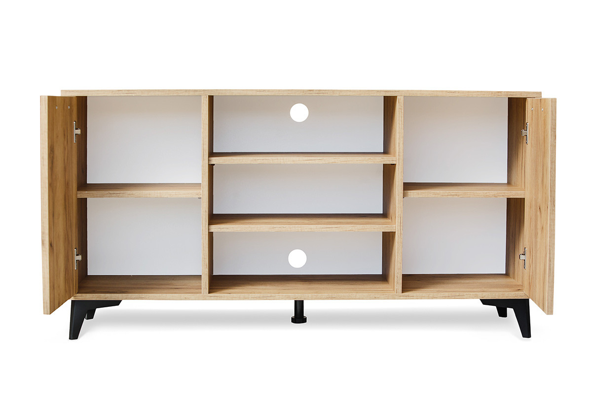 Komoda NORDIO wyróżnia się wysoką jakością wykonania i prostymi kształtami. Trzy półki na środku komody z otworami na kable pozwolą estetyczne wyeksponować sprzęt RTV lub inne dekoracje czy książki, a zamykane i pojemne półki po bokach pomogą schować wiele przedmiotów, które nie powinny rzucać się w oczy.W dodatku komoda spełni najbardziej wygórowane oczekiwania wizualne, gdyż czarne i wysokie nóżki oraz dopasowane do nich smukłe uchwyty w połączeniu z kolorem dębu naturalnego nadadzą komodzie stylu i lekkości.