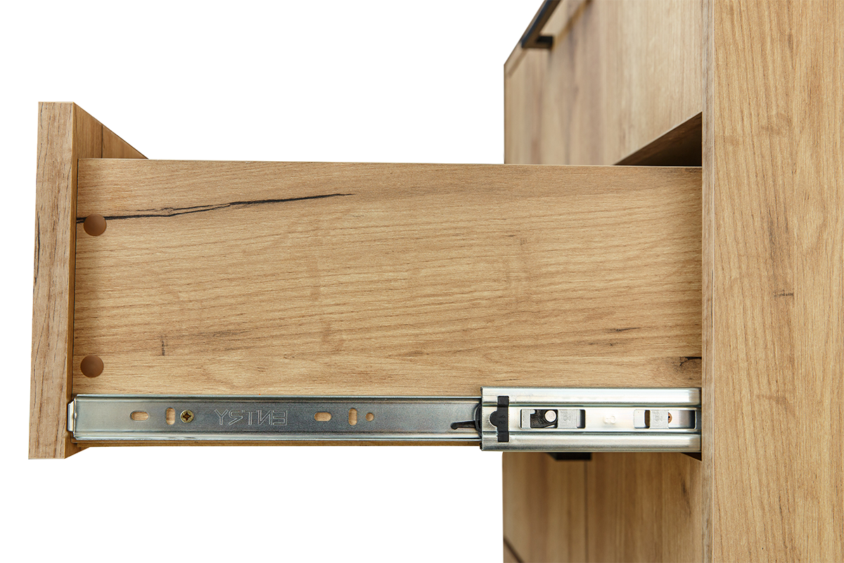 Komoda NORDIO wyróżnia się wysoką jakością wykonania i prostymi kształtami. Cztery szuflady pozwolą w łatwy sposób schować wiele przedmiotów, a wszystko to dzięki prowadnicom łożyskowym z pełnym wysówem, które gwarantują swobodny dostęp nawet do najgłębiej ukrytych rzeczy.Stylu i lekkości nadadzą komodzie czarne i wysokie nóżki oraz dopasowane do nich smukłe i podłużne uchwyty, co w połączeniu z kolorem dębu naturalnego sprawia, że komoda spełni najbardziej wygórowane oczekiwania wizualne.