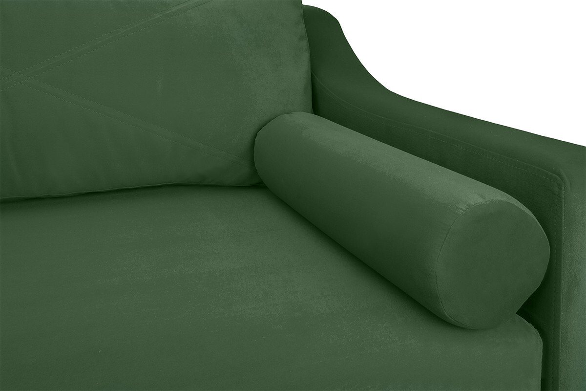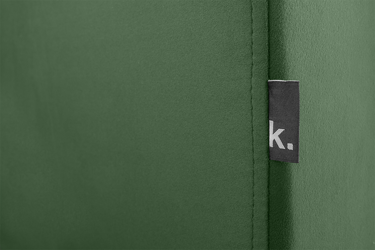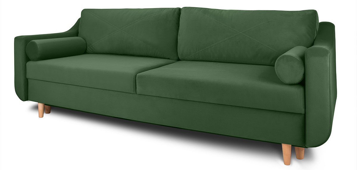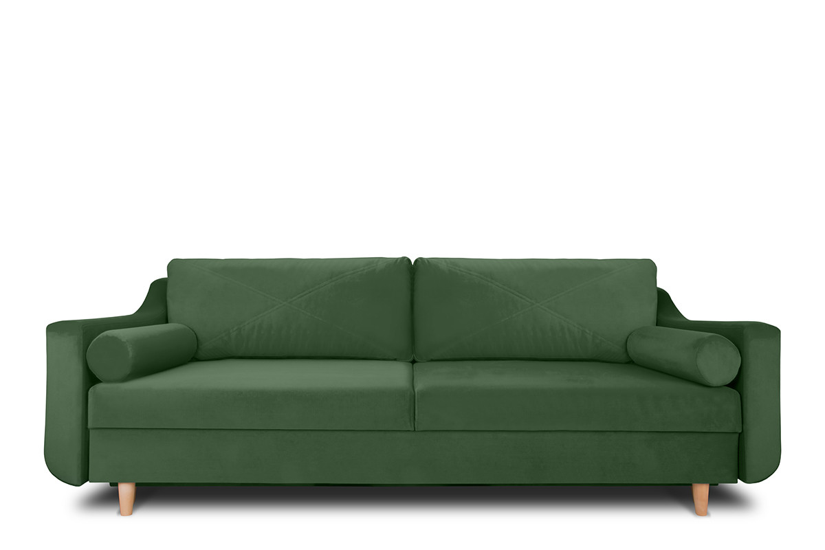 Welwetowe, ciemno-zielone obicie zdobione jest pikowaniami.Mechanizm błyskawicznego rozkładania uczyni z kanapy wygodne łóżko o dużej powierzchni spania. Pojemnik na pościel wyposażony jest w wywietrzniki. Sofa opiera się na nóżkach z drewna bukowego.