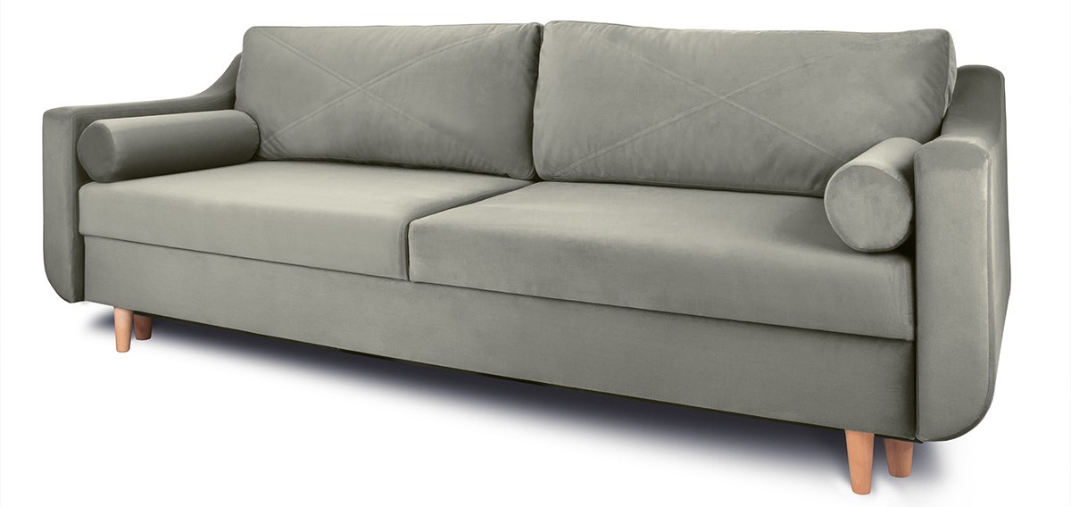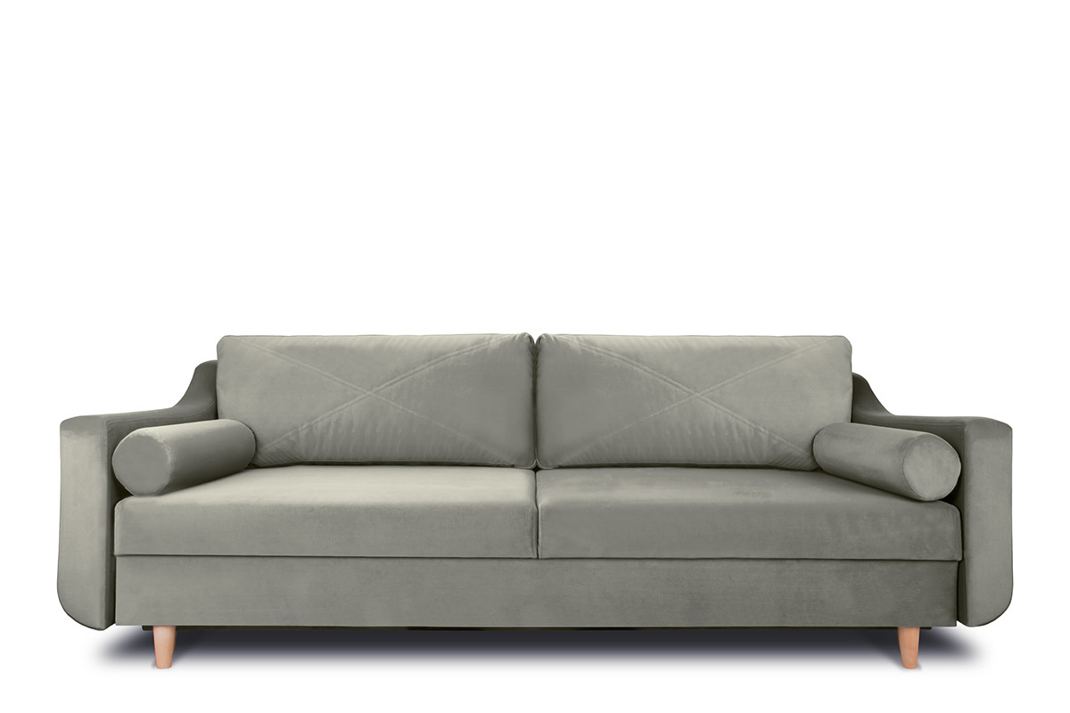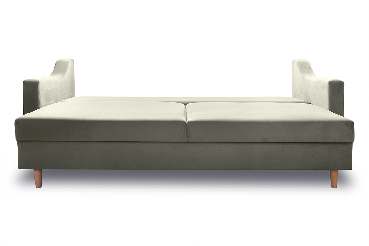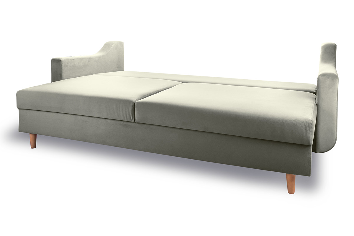 Welwetowe, ciemno-zielone obicie zdobione jest pikowaniami.Mechanizm błyskawicznego rozkładania uczyni z kanapy wygodne łóżko o dużej powierzchni spania. Pojemnik na pościel wyposażony jest w wywietrzniki. Sofa opiera się na nóżkach z drewna bukowego.