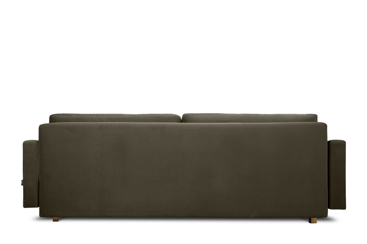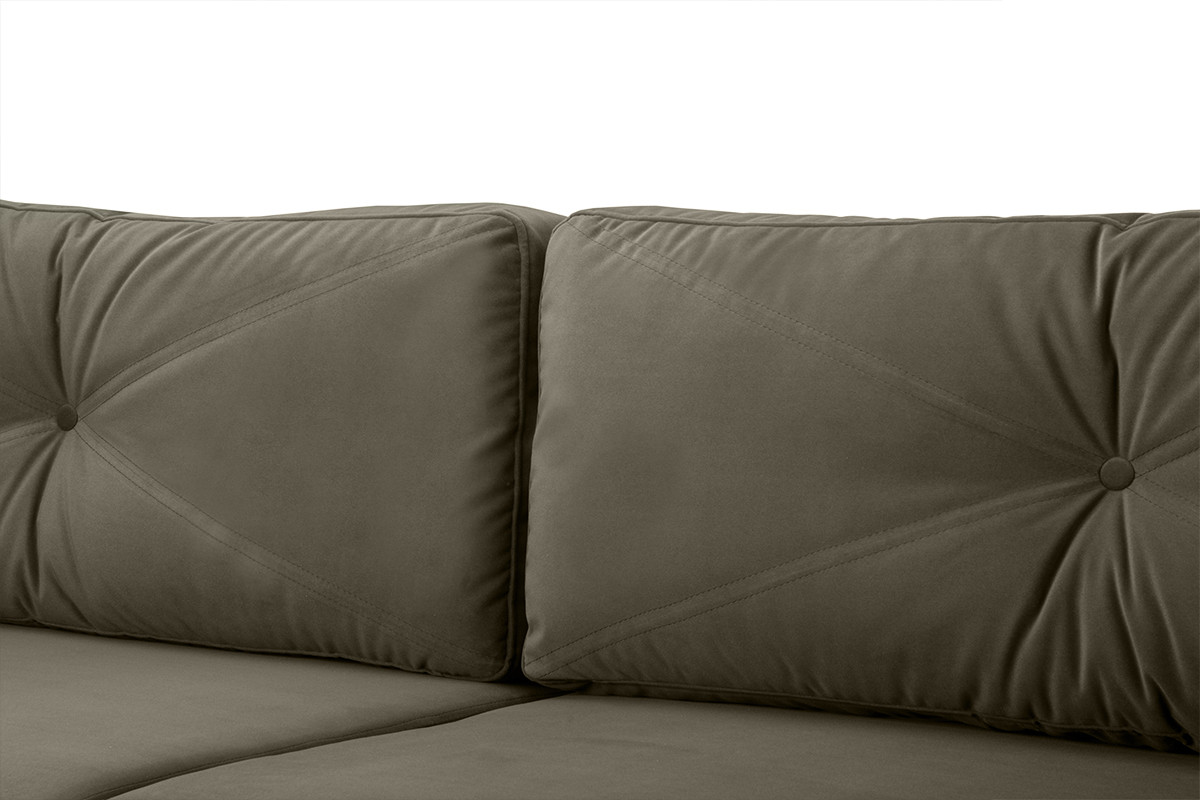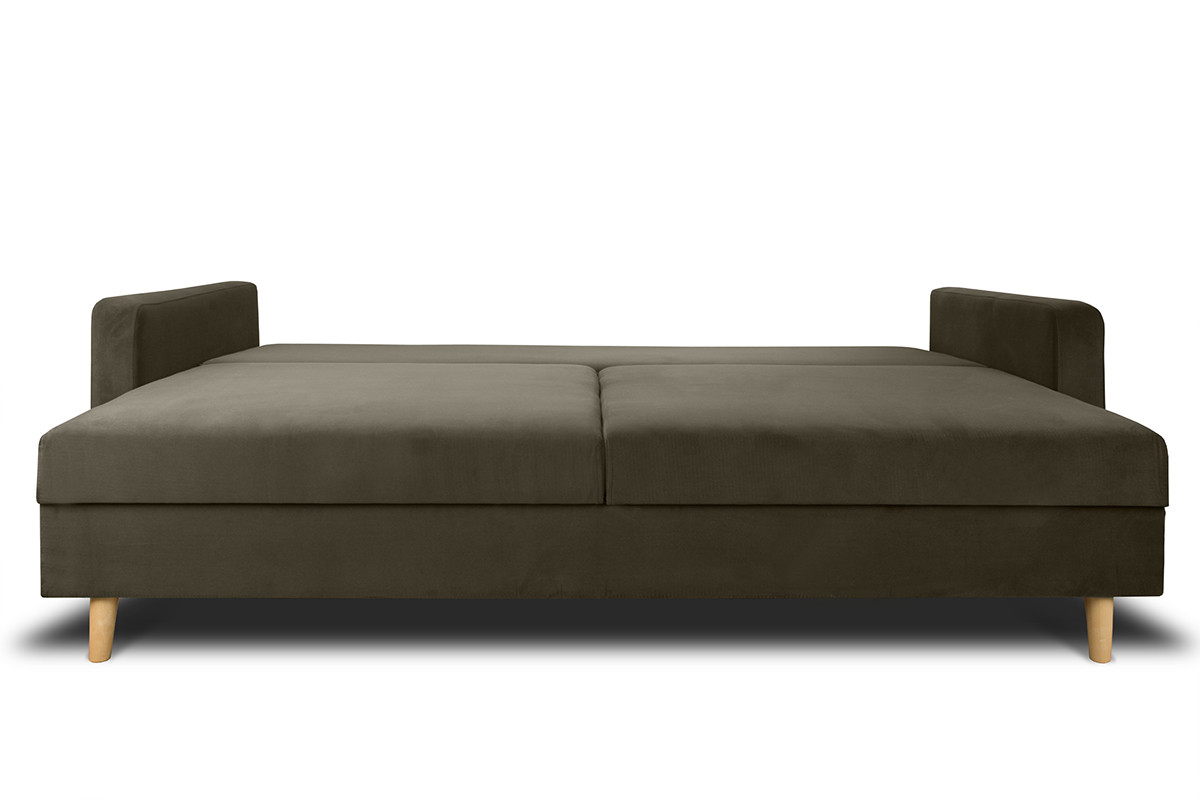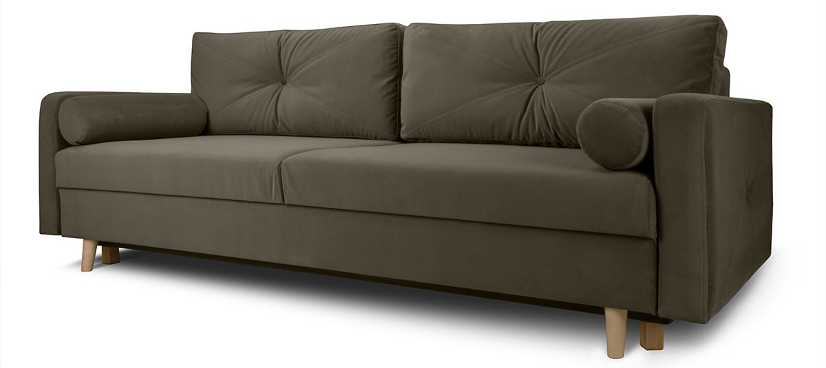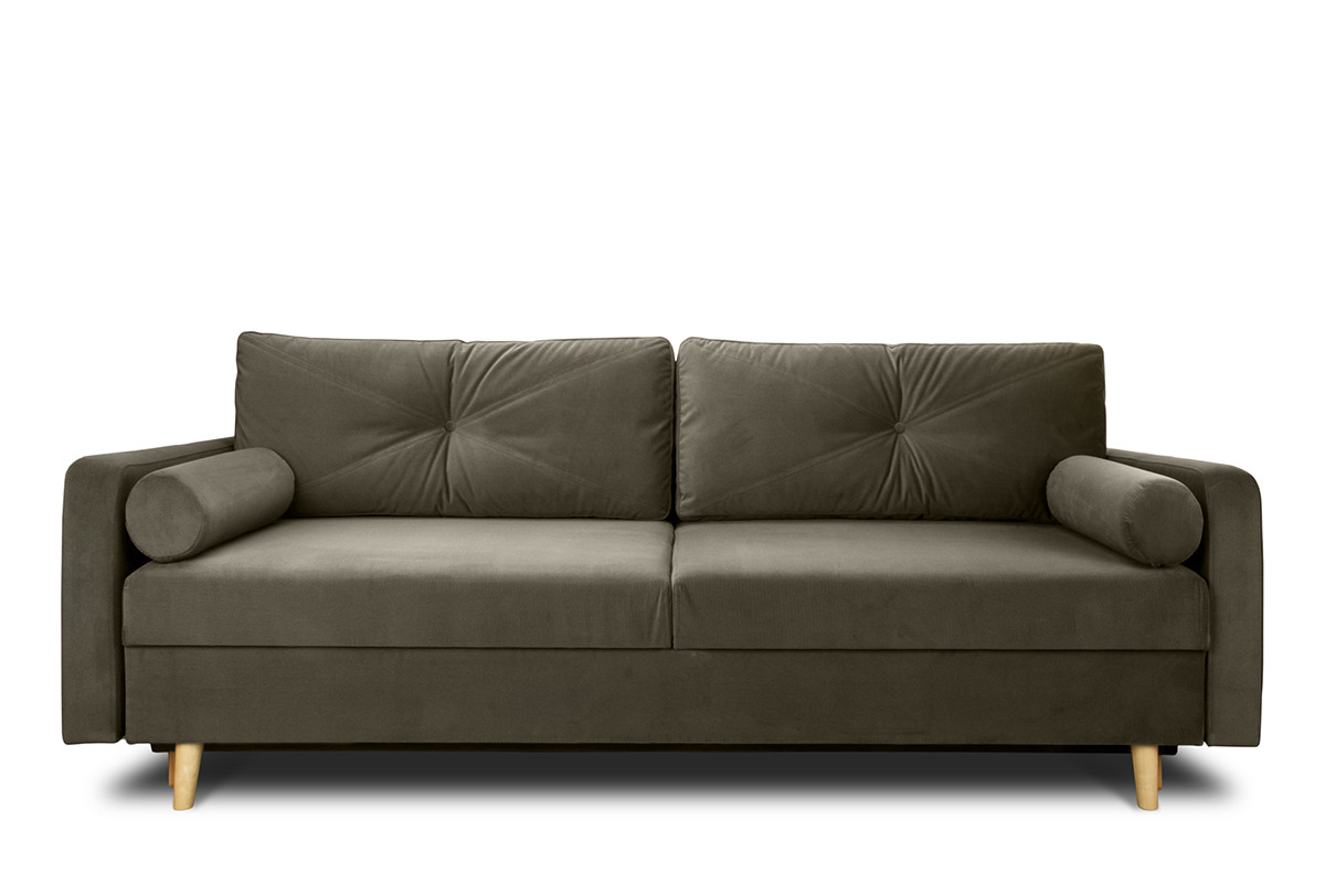 Welwetowe, ciemno-zielone obicie zdobione jest pikowaniami.Mechanizm błyskawicznego rozkładania uczyni z kanapy wygodne łóżko o dużej powierzchni spania. Pojemnik na pościel wyposażony jest w wywietrzniki. Sofa opiera się na nóżkach z drewna bukowego.