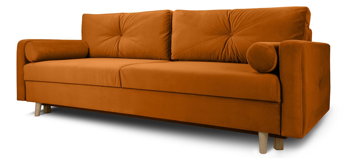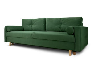 Welwetowe, ciemno-zielone obicie zdobione jest pikowaniami.Mechanizm błyskawicznego rozkładania uczyni z kanapy wygodne łóżko o dużej powierzchni spania. Pojemnik na pościel wyposażony jest w wywietrzniki. Sofa opiera się na nóżkach z drewna bukowego.