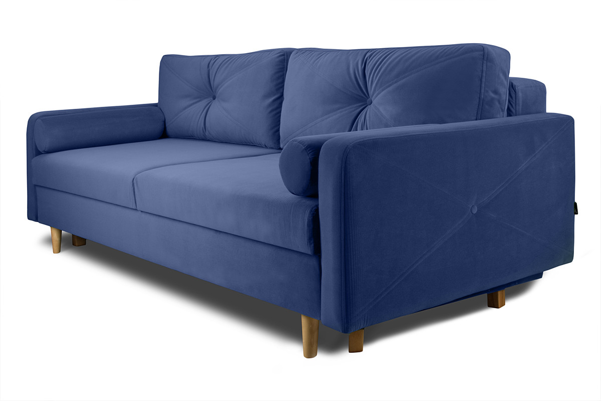 Welwetowe, ciemno-zielone obicie zdobione jest pikowaniami.Mechanizm błyskawicznego rozkładania uczyni z kanapy wygodne łóżko o dużej powierzchni spania. Pojemnik na pościel wyposażony jest w wywietrzniki. Sofa opiera się na nóżkach z drewna bukowego.