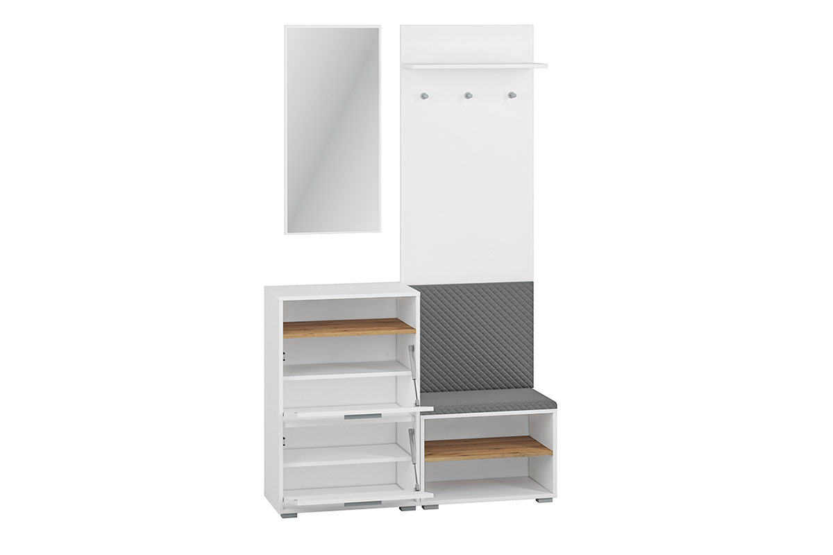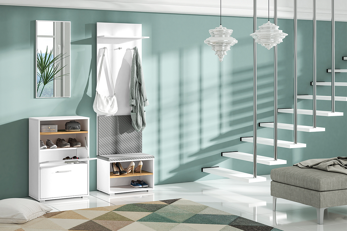 Zestaw mebli ERUCA to praktyczne połączenie czterech brył- wieszaka tapicerowanego, lustra i dwóch szafek na buty, jest to świetny sposób na wyposażenie przedpokoju lub garderoby. Szafki dają dużo miejsca na przechowywanie obuwia. Wyższa szafka posiada otwartą wnękę, gdzie możemy trzymać klucze czy dokumenty, żeby zawsze były łatwe do znalezienia. Lustro optycznie powiększy pomieszczenie i da możliwość sprawdzenia swojego wyglądu przed wyjściem.