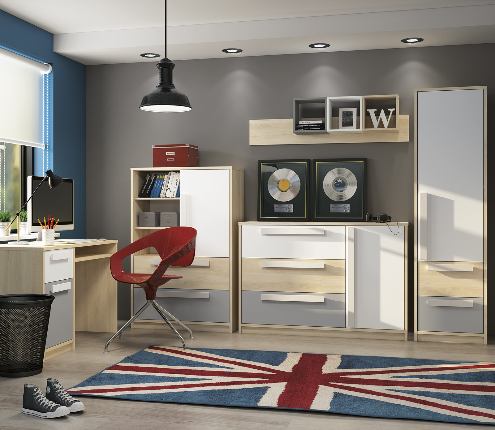 Komoda z kolekcji PONGO to zdecydowanie bardzo funkcjonalny mebel, zaprojektowany z myślą o pokoju młodzieżowym. Dzięki dwóm szufladom o zwiększonej ładowności przechowasz w niej również ciężkie przedmioty - bez obaw o utratę stabilności. W trosce o komfort użytkowania, szuflady wyposażone zostały w sprawdzone, bezawaryjne prowadnice kulkowe. W górnej części komody znajdują się półki, z których połowa ukryta została za drzwiczkami w kolorze bieli.