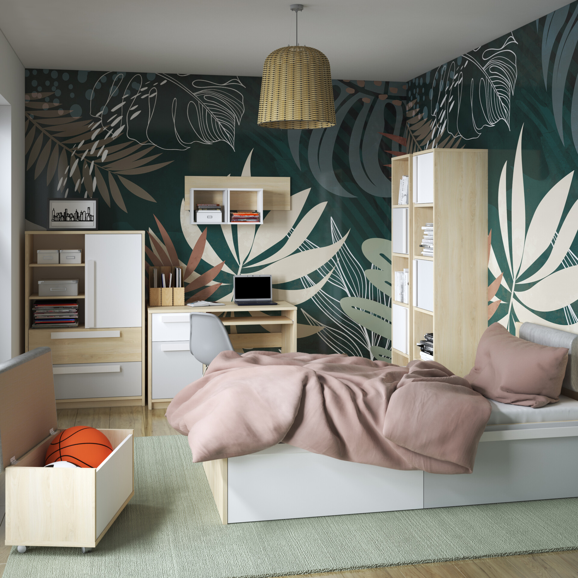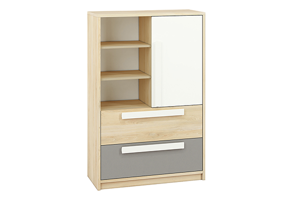 Komoda z kolekcji PONGO to zdecydowanie bardzo funkcjonalny mebel, zaprojektowany z myślą o pokoju młodzieżowym. Dzięki dwóm szufladom o zwiększonej ładowności przechowasz w niej również ciężkie przedmioty - bez obaw o utratę stabilności. W trosce o komfort użytkowania, szuflady wyposażone zostały w sprawdzone, bezawaryjne prowadnice kulkowe. W górnej części komody znajdują się półki, z których połowa ukryta została za drzwiczkami w kolorze bieli.