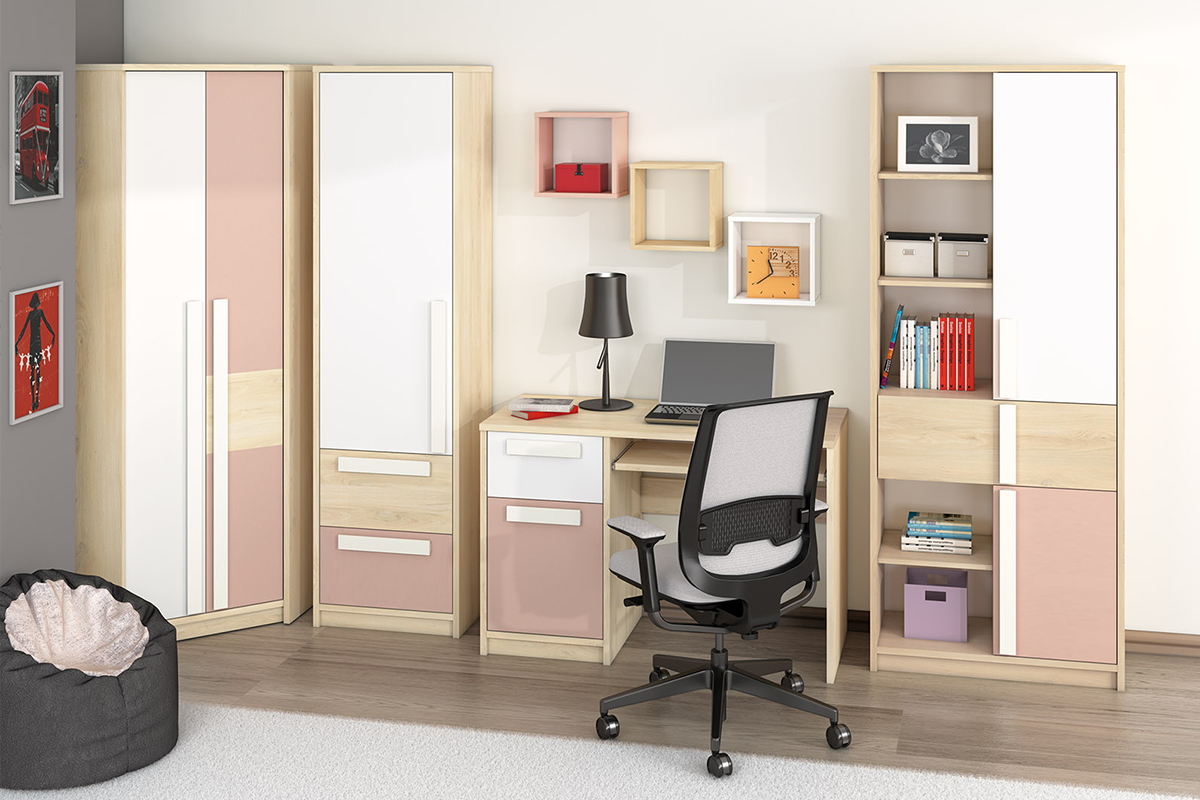 Solidna komoda z kolekcji PONGO to mebel pasujący w sam raz do pokoju młodzieżowego. Oryginalne, żywe połączenia kolorów i geometryczne, nowoczesne uchwyty sprawią, że będzie ona doskonałą ozdobą pomieszczenia. Wyposażona została w trzy szuflady o wzmocnionym dnie, oparte na cichych prowadnicach kulkowych. Po prawej stronie znajduje się półka ukryta za drzwiczkami.