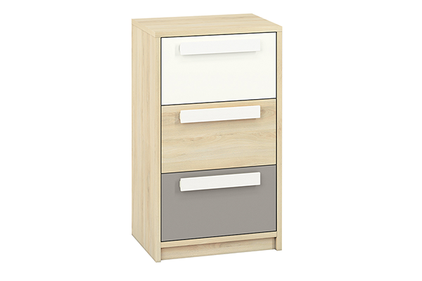 Wąska i niska komoda z kolekcji PONGO to doskonałe rozwiązanie nawet dla małych sypialni czy pokoi młodzieżowych. Dzięki swoim niewielkim rozmiarom nie przytłoczy pomieszczenia, zapewniając jednocześnie wygodne miejsce do przechowywania przedmiotów codziennego użytku. Trzy szuflady o wzmocnionym dnie zostały wyposażone w ciche, bezawaryjne prowadnice kulkowe. Białe, geometryczne uchwyty są oryginalnym akcentem i tworzą ciekawą kompozycję z frontami w trzech różnych kolorach.