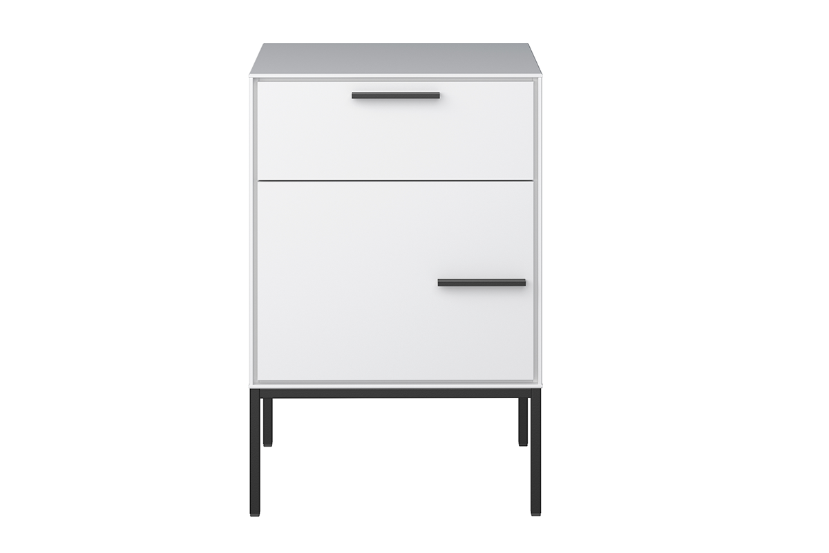 Piękny w swej prostocie stolik nocny, ma geometryczny kształt i jest wyposażony w szufladę i pojemną, zamykaną półkę, które pomieszczą wszystkie potrzebne w sypialni skarby. Korpus jest w klasycznym kolorze białym, stalowe uchwyty i nóżki są czarne, wykonane z eleganckiej i gładkiej stali. Ten stolik do sypialni z pewnością przypadnie do gustu tym, którzy kochają minimalizm, a funkcjonalność mebli jest dla nich równie istotna, jak ich design. Stolik nocny jest wykonany z trwałej płyty meblowej, w intensywnym kolorze. Stalowe wykończenia gwarantują wygodne i niezawodne korzystanie z mebla przez długi czas.