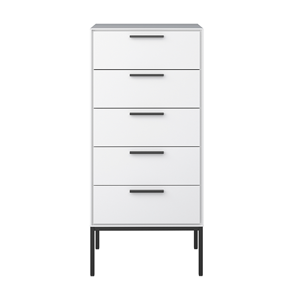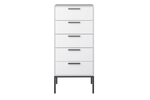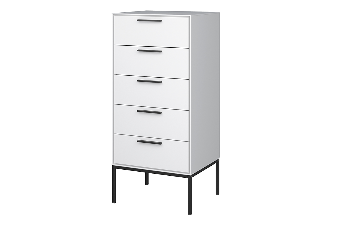 Wysoka stylowa komoda z 5 pojemnymi szufladami, na stalowych nogach. Komoda jest w kolorze białym, a dla kontrastu jej nogi są czarne, całość wykończona jest podłużnymi, prostokątnymi uchwytami. Ta nowoczesna komoda, pomieści skarby małe i duże, ważne i ważniejsze.Komoda w stylu loft jest doskonała do nowoczesnych i minimalistycznych mieszkań. Jest wykonana z wysokiej jakości materiałów, a zamontowane, solidne mechanizmy, gwarantują możliwość długiego, bezproblemowego użytku.